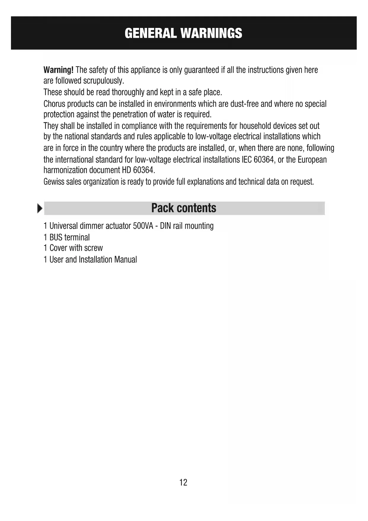 They shall be installed in compliance with the requirements for household devices set out by the national standards and rules applicable to low-voltage electrical installations which are in force in the country where the products are installed, or, when there are none, following the international standard for low-voltage electrical installations IEC 60364, or the European harmonization document HD 60364.