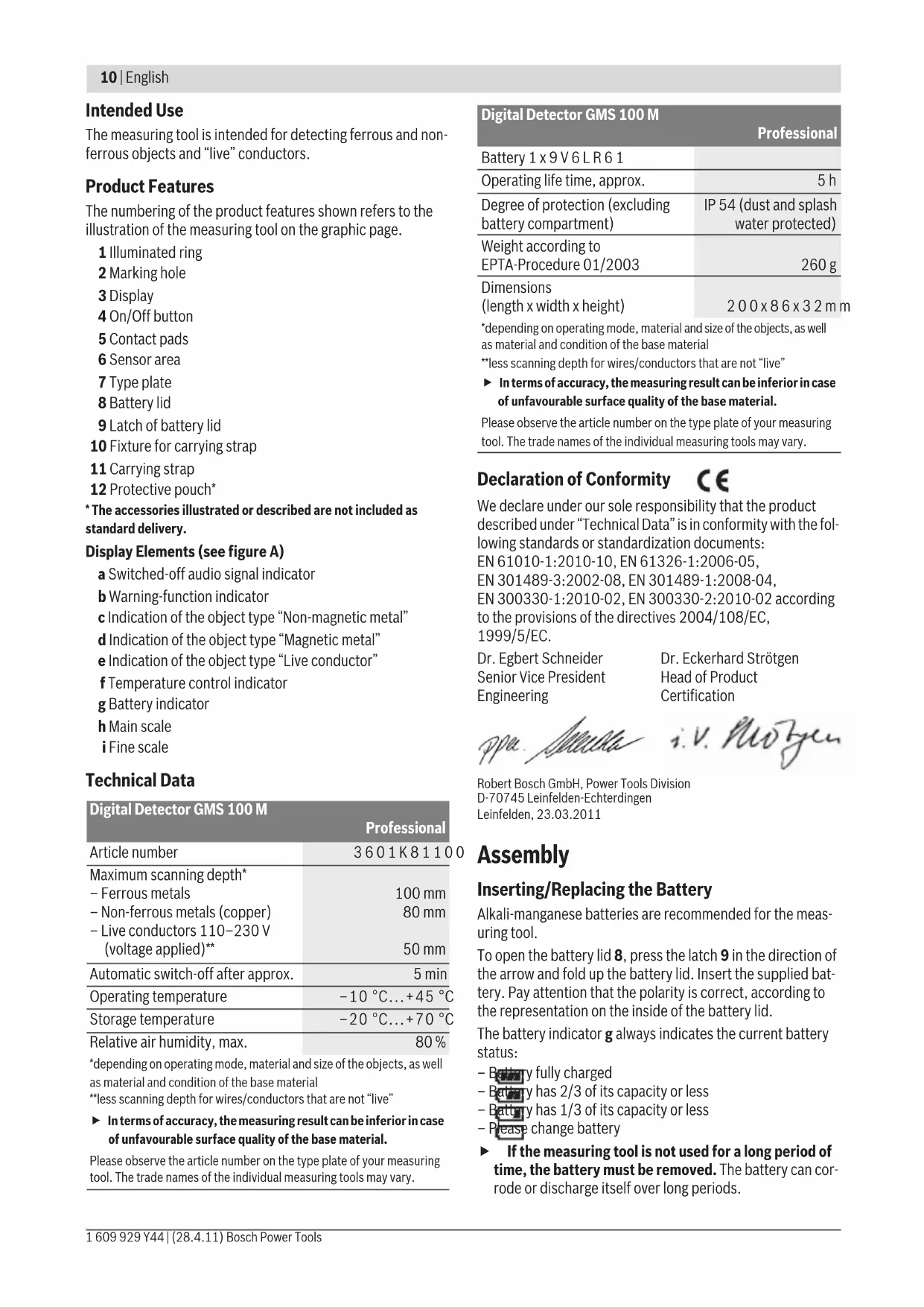 | Degree of protection (excluding battery compartment) | IP 54 (dust and splash water protected) |