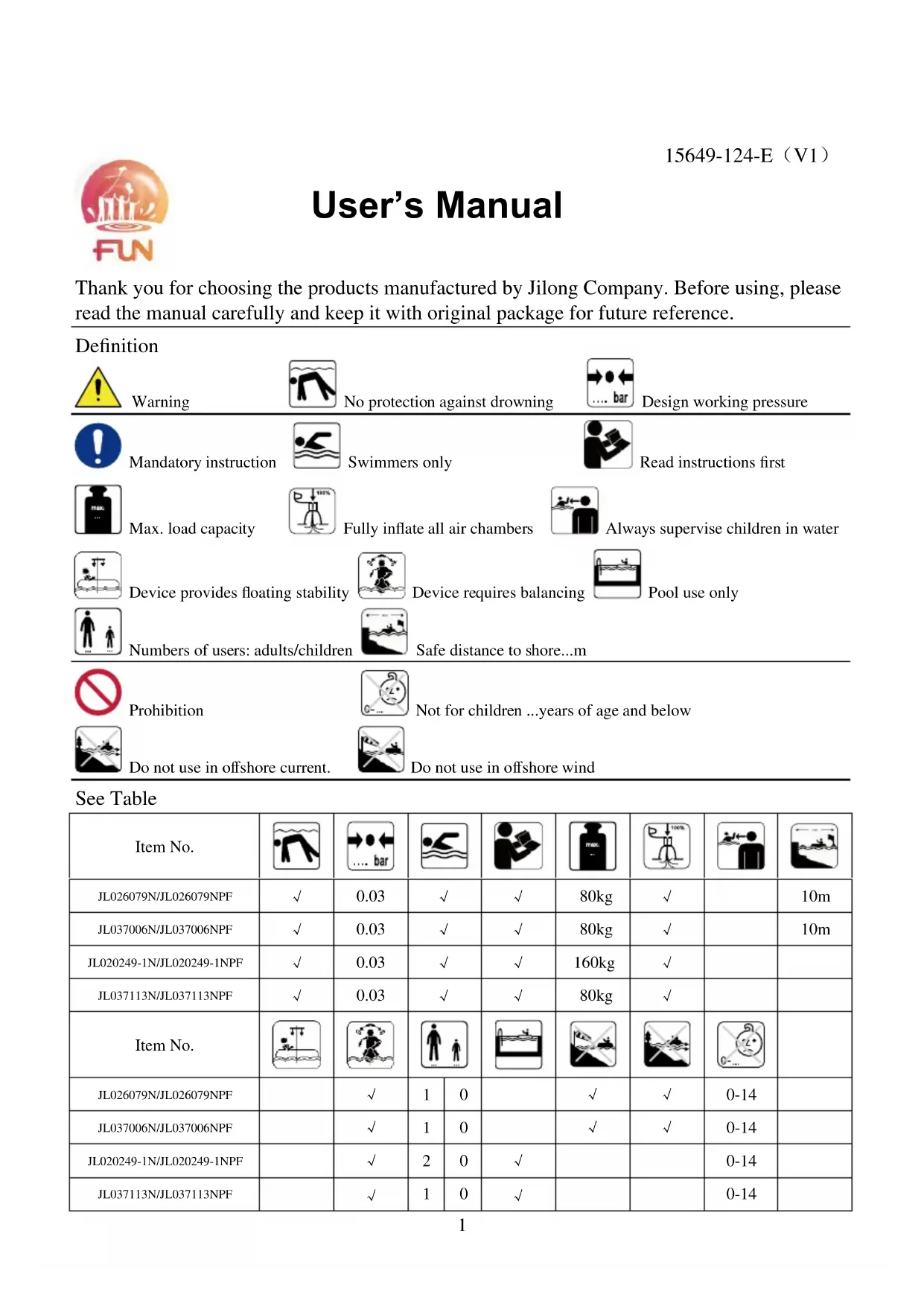 Thank you for choosing the products manufactured by Jilong Company. Before using, please read the manual carefully and keep it with original package for future reference. Definition Warning No protection against drowning Design working pressure Mandatory instruction Swimmers only Read instructions first Max. load capacity Fully inflate all air chambers Always supervise children in water Device provides floating stability Device requires balancing Pool use only Numbers of users: adults/children Safe distance to shore...m Prohibition Not for children ...years of age and below Do not use in offshore current. Do not use in offshore wind See Table Item No.