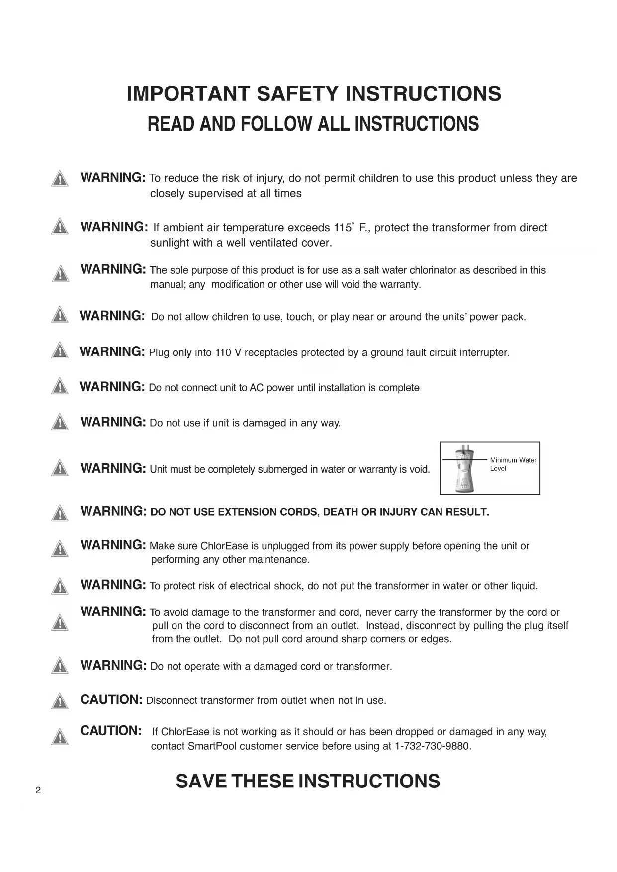 CAUTION: If ChlorEase is not working as it should or has been dropped or damaged in any way, contact SmartPool customer service before using at 1-732-730-9880.