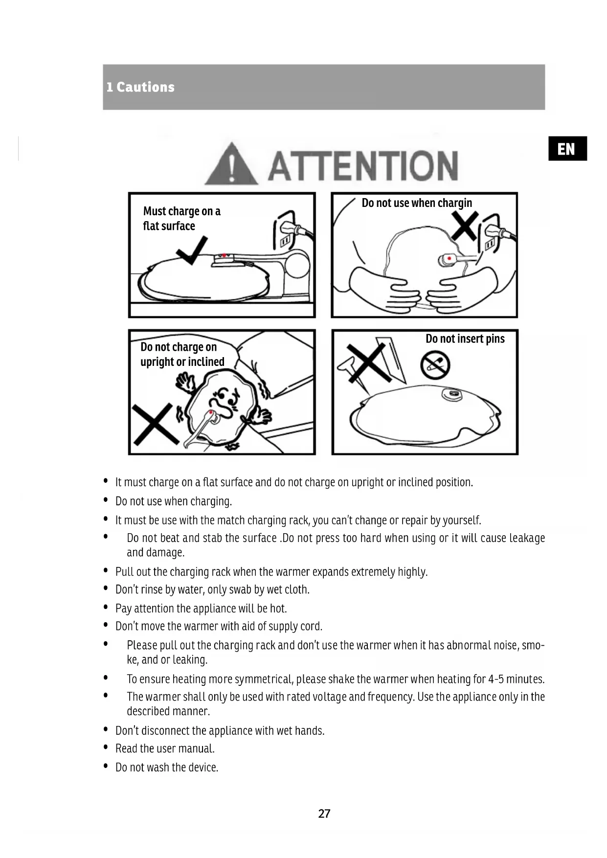 - Please pull out the charging rack and don't use the warmer when it has abnormal noise, smoke, and or leaking.