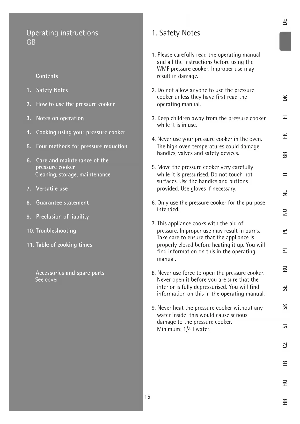 We guarantee the full functionality of the pro- duct and all its parts during the guarantee pe- riod. The guarantee period is 3 years. It starts on the date the product is bought from the WMF dealer; this must be documented by a gua- rantee slip fully completed by the WMF dealer. If the product becomes defective during the guarantee period, we will remedy the defect free of charge, replacing the defective parts with new ones. Defective parts can only be replaced by a WMF dealer or by the WMF AG Customer Service Department in Geislingen/Steige. The guarantee claim extends exclusively to this claim. Any further claims deriving from the guarantee are ruled out. The guarantee slip must be submitted when claiming under guarantee. This guarantee slip must be given to the WMF dealer together with the WMF pressure cooker. The guarantee entitlement only exists upon presentation of the fully completed slip. Of course, this guarantee statement does not affect your statutory warranty rights. Within the warranty period, you have statutory warranty rights to retrospective performance, abatement, repudiation and damage compen- sation to the extent prescribed by law. The guarantee obligation does not cover the following: – Cooking indicator seal – Seal, residual pressure safety device – Seal, steam-off aperture – Safety valve – Sealing ring – Batteries These parts are subject to natural wear- and-tear. 10-year supply guarantee on the corresponding spare parts.22