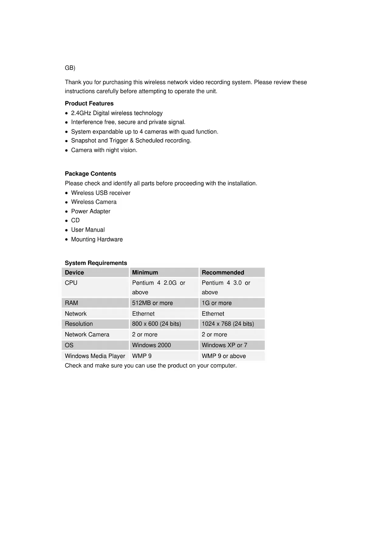Windows 2000 Windows XP or 7 Windows Media Player WMP 9 WMP 9 or above Check and make sure you can use the product on your computer.Install USB camera