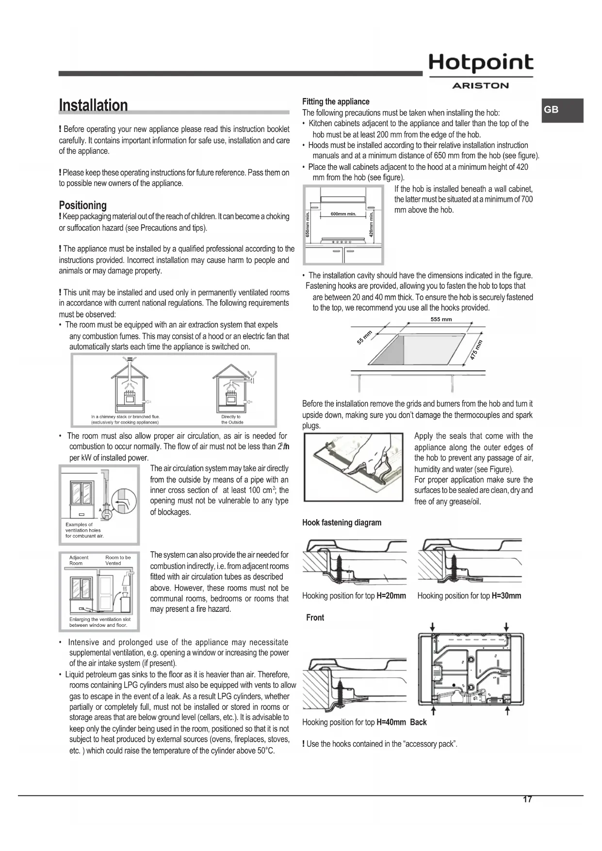 - The installation cavity should have the dimensions indicated in the gure. Fastening hooks are provided, allowing you to fasten the hob to tops that are between 20 and 40 mm thick. To ensure the hob is securely fastened to the top, we recommend you use all the hooks provided. 555 mm 55 mm 475 mm Before the installation remove the grids and burners from the hob and turn it upside down, making sure you don’t damage the thermocouples and spark plugs. Apply the seals that come with the appliance along the outer edges of the hob to prevent any passage of air, humidity and water (see Figure). For proper application make sure the surfaces to be sealed are clean, dry and free of any grease/oil. Hook fastening diagram Hooking position for top H=20mm Hooking position for top H=30mm Front Hooking position for top H=40mm Back ! Use the hooks contained in the “accessory pack”. 600mm min. 420mm min. 650mm min.18