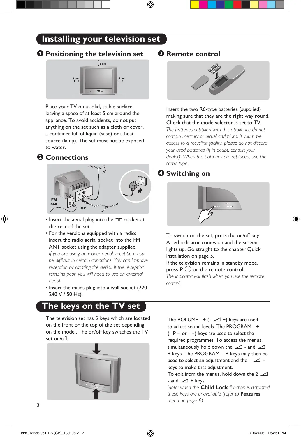 Information for users in the UK Positioning the TV For the best results, choose a position where light does not fall directly on the screen, and at some distance away from radiators or other sources of heat. Leave a space of at least 5 cm all around the TV for ventilation, making sure that curtains, cupboards etc. cannot obstruct the air flow through the ventilation apertures.The TV is intended for use in a domestic environment only and should never be operated or stored in excessively hot or humid atmospheres. General Points Please take note of the section entitled 'Tips' at the end of this booklet. Interference The Department of Trade and Industry operates a Radio Interference Investigation Service to help TV licence holders improve reception of BBC and IBA programmes where they are being spoilt by interference. If your dealer cannot help, ask at a main Post Office for the booklet "How to Improve Television and Radio Reception". Mains connection Before connecting the TV to the mains, check that the mains supply voltage corresponds to the voltage printed on the type plate on the rear panel of the TV. If the mains voltage is different, consult your dealer.