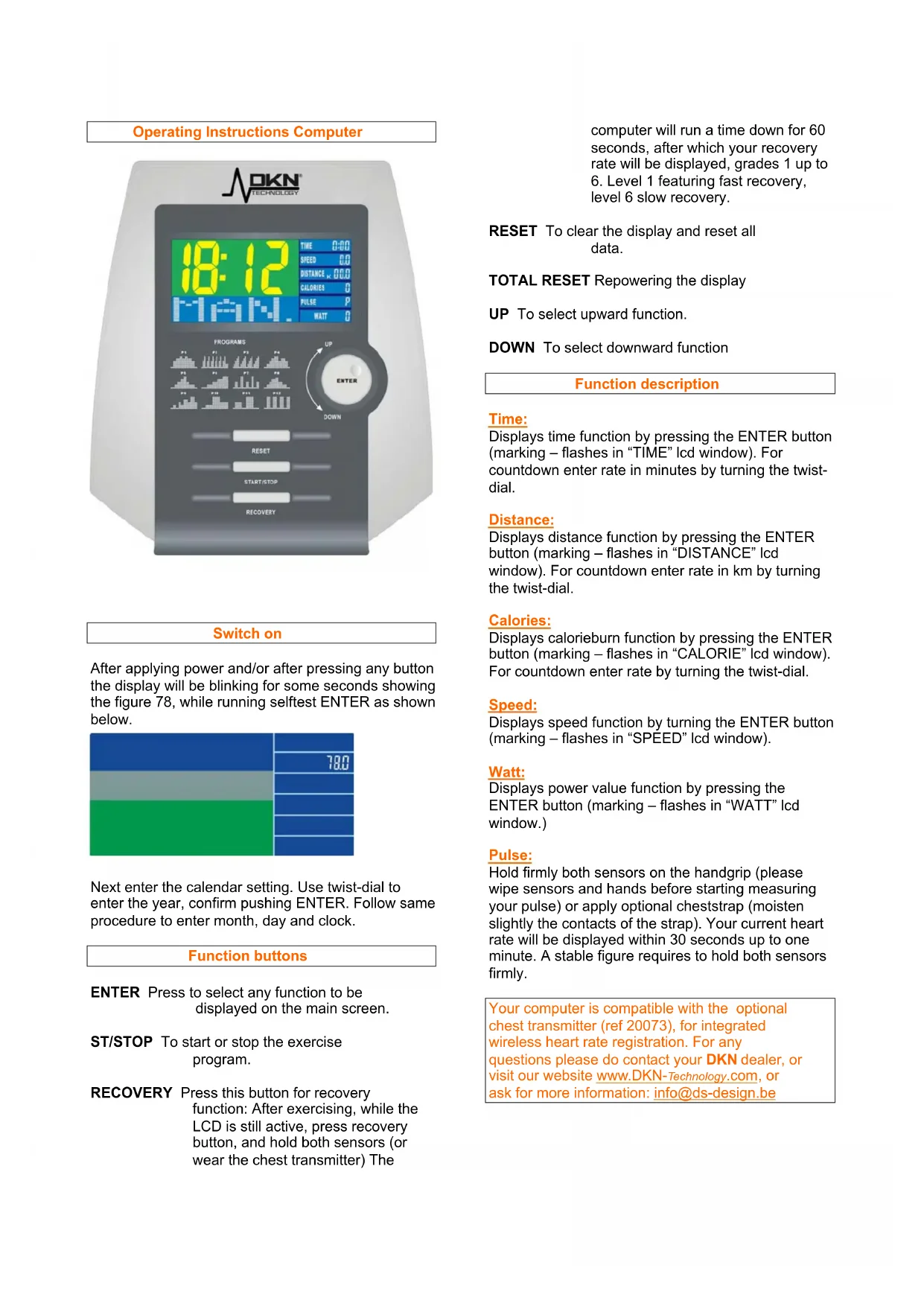 Your computer is compatible with the optional chest transmitter (ref 20073), for integrated wireless heart rate registration. For any questions please do contact your DKN dealer, or visit our website www.DKN-Technology.com, or ask for more information: info@ds-design.be