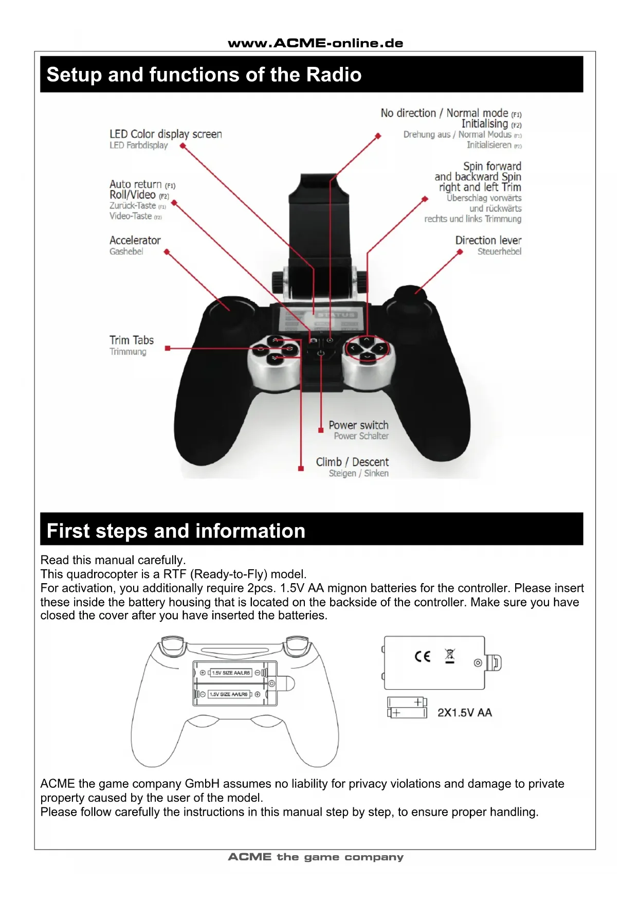 » New devices and their components exhibiting defects within 24 months from the purchase due to manufacturing and / or material faults, are ACME the game company at its option, reflecting the current state of the art exchanged or repaired free device. For wear parts (eg batteries, motors, etc.), this warranty is valid or 3 months from purchase.