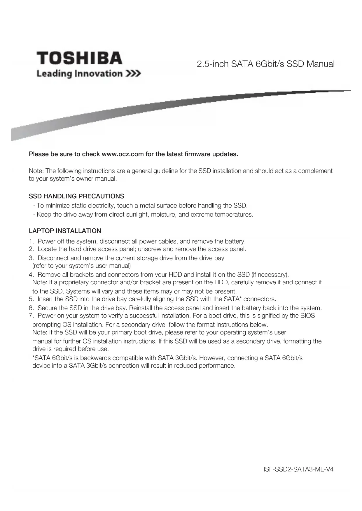 Note: If the SSD will be your primary boot drive, please refer to your operating system’s user manual for further OS installation instructions. If this SSD will be used as a secondary drive, formatting the drive is required before use. *SATA 6Gbit/s is backwards compatible with SATA 3Gbit/s. However, connecting a SATA 6Gbit/s device into a SATA 3Gbit/s connection will result in reduced performance.