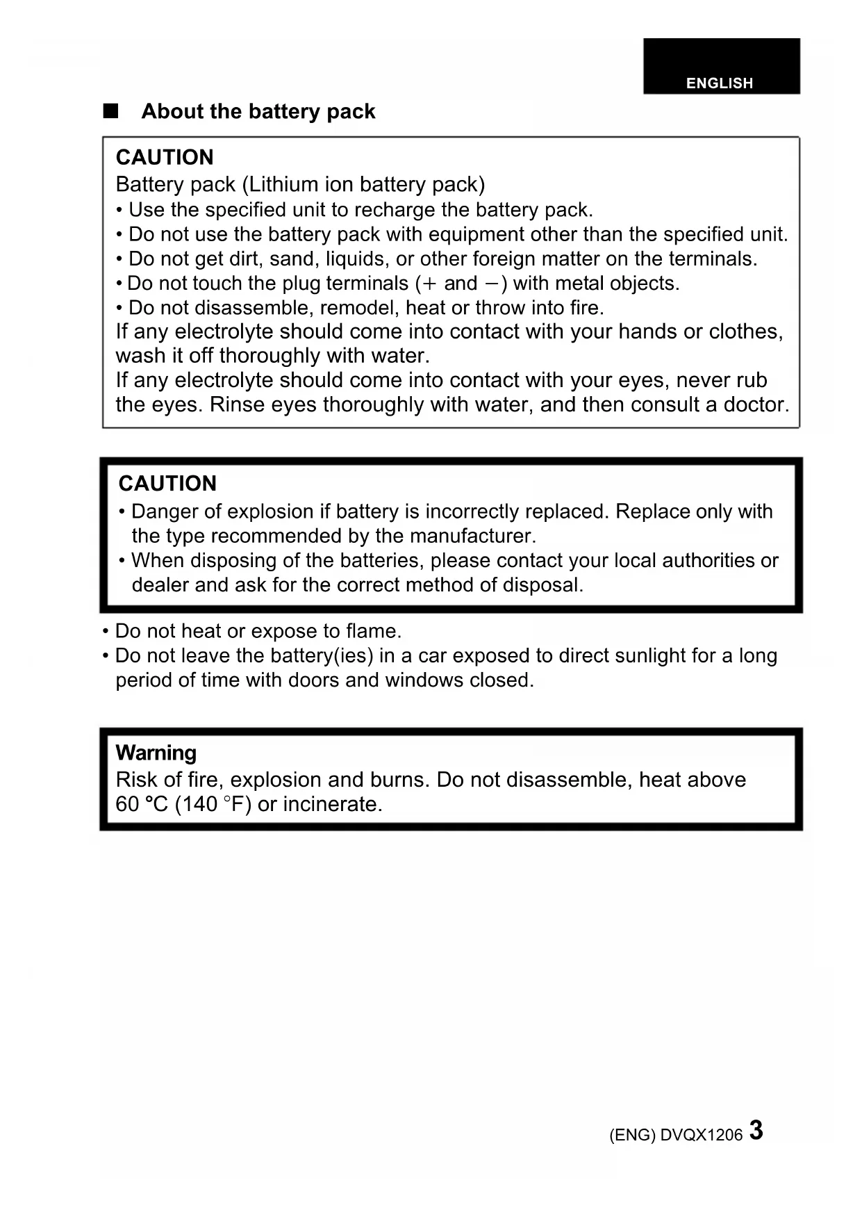- Do not install or place this unit in a bookcase, built-in cabinet or in another confined space. Ensure this unit is well ventilated. DVQX1206.book 2 ページ 2017年2月6日 月曜日 午後5時29分3 (ENG) DVQX1206 ENGLISH ∫ About the battery pack