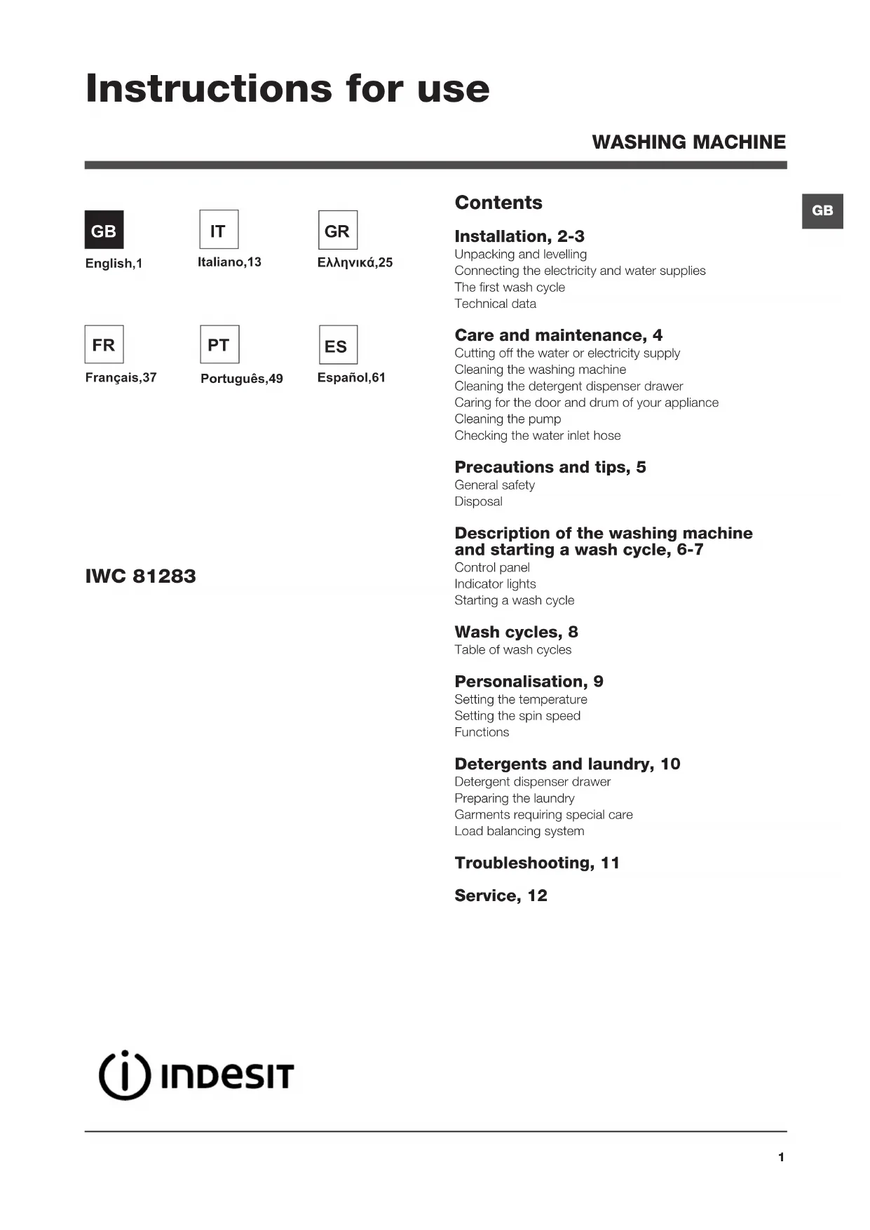 Contents Installation, 2-3 Unpacking and levelling Connecting the electricity and water supplies The first wash cycle Technical data Care and maintenance, 4 Cutting off the water or electricity supply Cleaning the washing machine Cleaning the detergent dispenser drawer Caring for the door and drum of your appliance Cleaning the pump Checking the water inlet hose Precautions and tips, 5 General safety Disposal Description of the washing machine and starting a wash cycle, 6-7 Control panel Indicator lights Starting a wash cycle Wash cycles, 8 Table of wash cycles Personalisation, 9 Setting the temperature Setting the spin speed Functions Detergents and laundry, 10 Detergent dispenser drawer Preparing the laundry Garments requiring special care Load balancing system Troubleshooting, 11 Service, 12 IWC 81283 Instructions for use WASHING MACHINE English,1