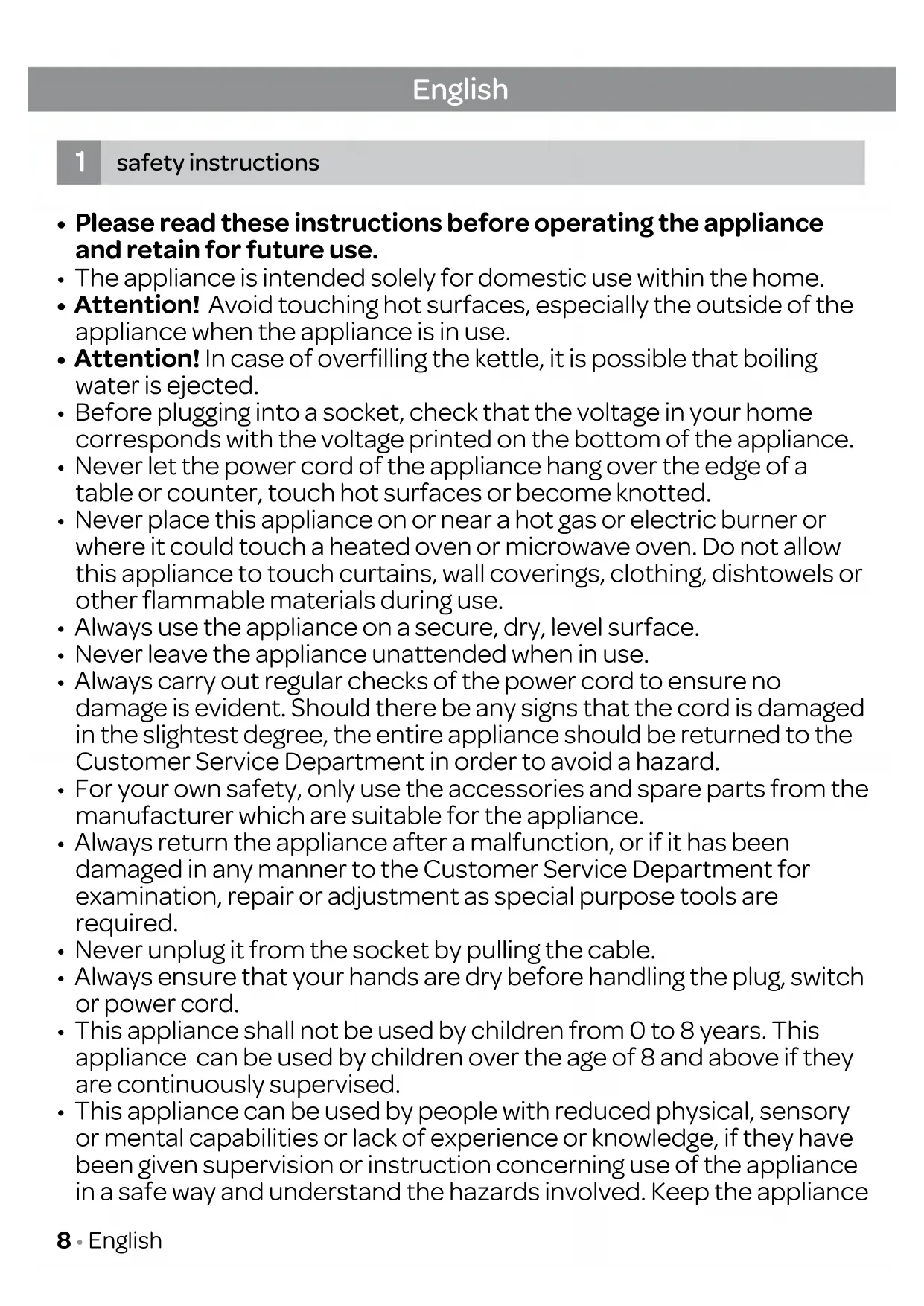 - This appliance shall not be used by children from 0 to 8 years. This appliance can be used by children over the age of 8 and above if they are continuously supervised.