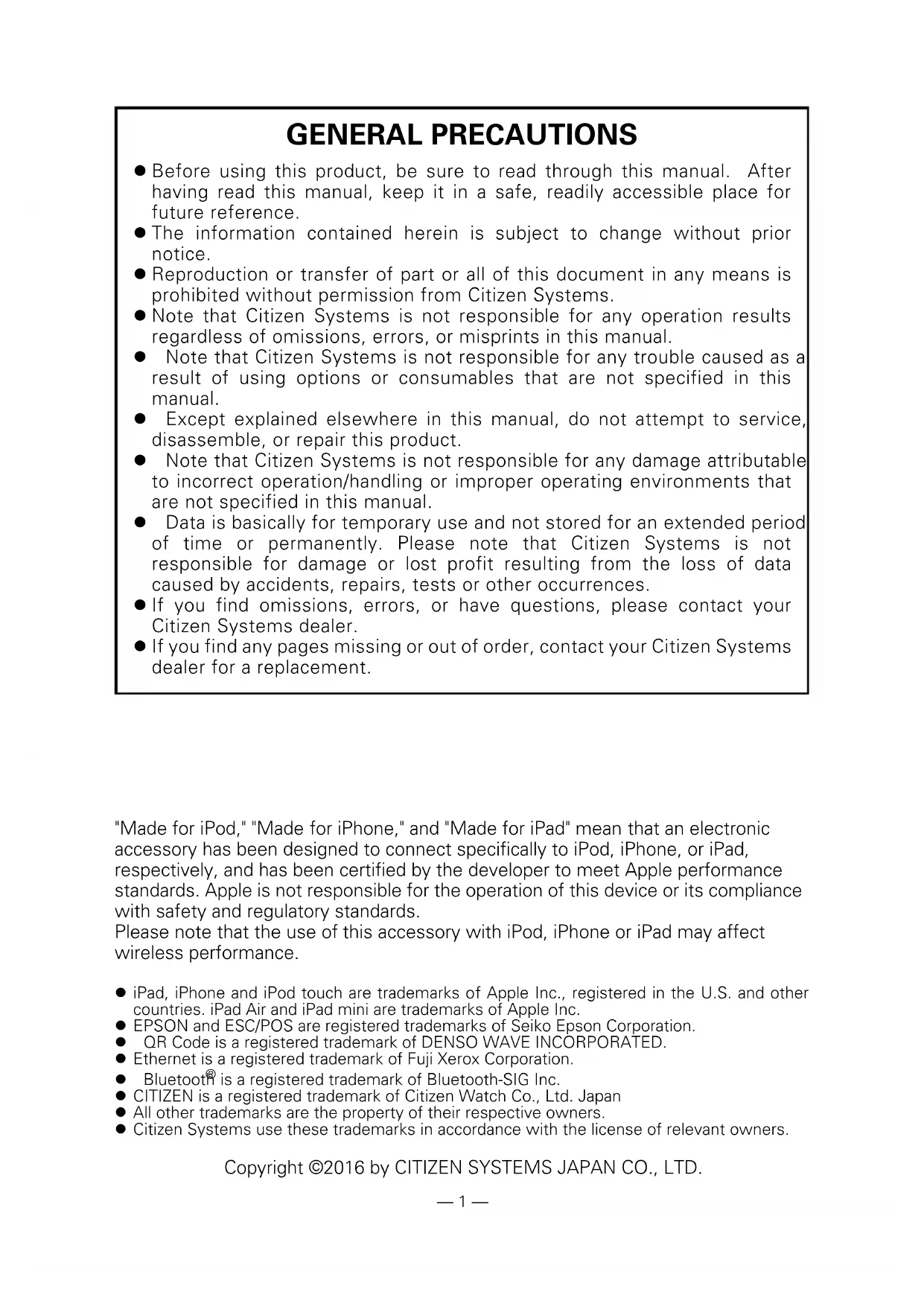 EMC: EN55022 Class A EN61000-3-2 EN61000-3-3 EN55024 This declaration applies only to the 230-V model. IMPORTANT: This equipment generates, uses, and can radiate radio frequency energy and if not installed and used in accordance with the instruction manual, may cause interference to radio communications. It has been tested and found to comply with the limits for a Class A computing device pursuant to Subpart J of Part 15 of FCC Rules, which are designed to provide reasonable protection against such interference when operated in a commercial environment. Operation of this equipment in a residential area is likely to cause interference, in which case the user at his own expense will be required to take whatever measures may be necessary to correct the interference. CAUTION: Use shielded cable for this equipment. Sicherheitshinweis Die Steckdose zum Anschluß dieses Druckers muß nahe dem Gerät angebracht und leicht zugänglich sein. For Uses in Canada This Class A Information Technology Equipment (ITE) complies with Canadian CAN ICES-3(A)/NMB-3(A). This Information Technology Equipment (ITE) does not exceed the Class A limits for radio noise emissions from digital apparatus set out in the Radio Interference Regulations of the Canadian Department of Communications. Pour L’utilisateurs Canadiens Cet Equipements informatiques (EI) de la classe A est conforme a la norme CAN ICES- 3(A)/NMB-3(A) du Canada. Le present Equipements informatiques (EI) n'emet pas de bruite radio electriques depassant les limites applicables aux appareils numeriques de la classe A prescrites dans le Reglement sur le brouillage radioelectrique edicte par le ministere des Communications du Canada.ENGLISH—1— GENERAL PRECAUTIONS Before using this product, be sure to read through this manual. After having read this manual, keep it in a safe, readily accessible place for future reference. The information contained herein is subject to change without prior notice. Reproduction or transfer of part or all of this document in any means is prohibited without permission from Citizen Systems. Note that Citizen Systems is not responsible for any operation results regardless of omissions, errors, or misprints in this manual. Note that Citizen Systems is not responsible for any trouble caused as a result of using options or consumables that are not specified in this manual. Except explained elsewhere in this manual, do not attempt to service, disassemble, or repair this product. Note that Citizen Systems is not responsible for any damage attributable to incorrect operation/handling or improper operating environments that are not specified in this manual. Data is basically for temporary use and not stored for an extended period of time or permanently. Please note that Citizen Systems is not responsible for damage or lost profit resulting from the loss of data caused by accidents, repairs, tests or other occurrences. If you find omissions, errors, or have questions, please contact your Citizen Systems dealer. If you find any pages missing or out of order, contact your Citizen Systems dealer for a replacement. "Made for iPod," "Made for iPhone," and "Made for iPad" mean that an electronic accessory has been designed to connect specifically to iPod, iPhone, or iPad, respectively, and has been certified by the developer to meet Apple performance standards. Apple is not responsible for the operation of this device or its compliance with safety and regulatory standards. Please note that the use of this accessory with iPod, iPhone or iPad may affect wireless performance. iPad, iPhone and iPod touch are trademarks of Apple Inc., registered in the U.S. and other countries. iPad Air and iPad mini are trademarks of Apple Inc. EPSON and ESC/POS are registered trademarks of Seiko Epson Corporation. QR Code is a registered trademark of DENSO WAVE INCORPORATED. Ethernet is a registered trademark of Fuji Xerox Corporation. Bluetooth
