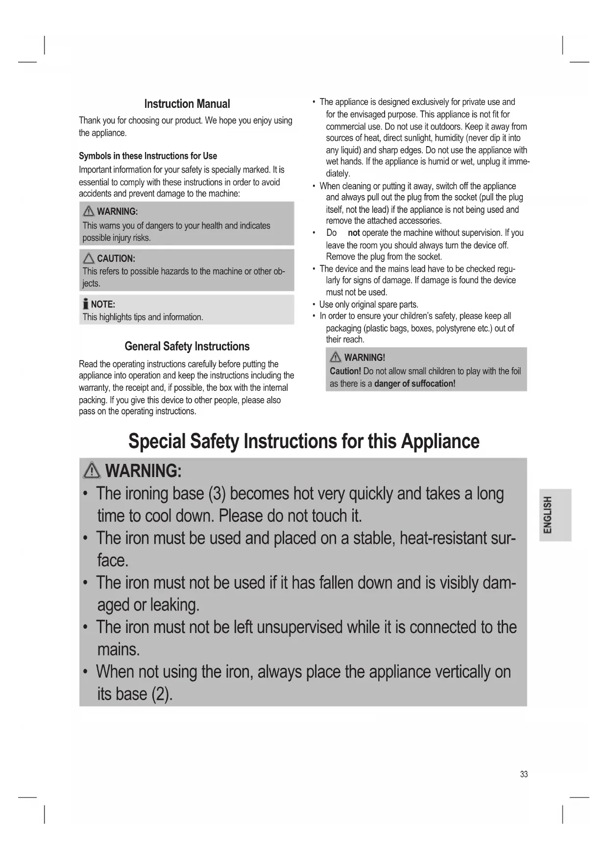 - In order to ensure your children’s safety, please keep all packaging (plastic bags, boxes, polystyrene etc.) out of their reach. WARNING! Caution! Do not allow small children to play with the foil as there is a danger of suffocation! Special Safety Instructions for this Appliance