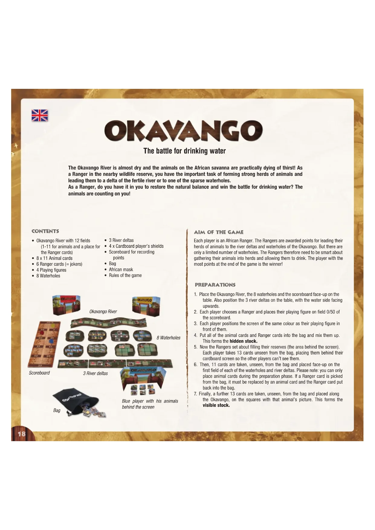 PREPARATIONS Okavango River 8 Waterholes Scoreboard 3 River deltas Blue player with his animals behind the screen Bag