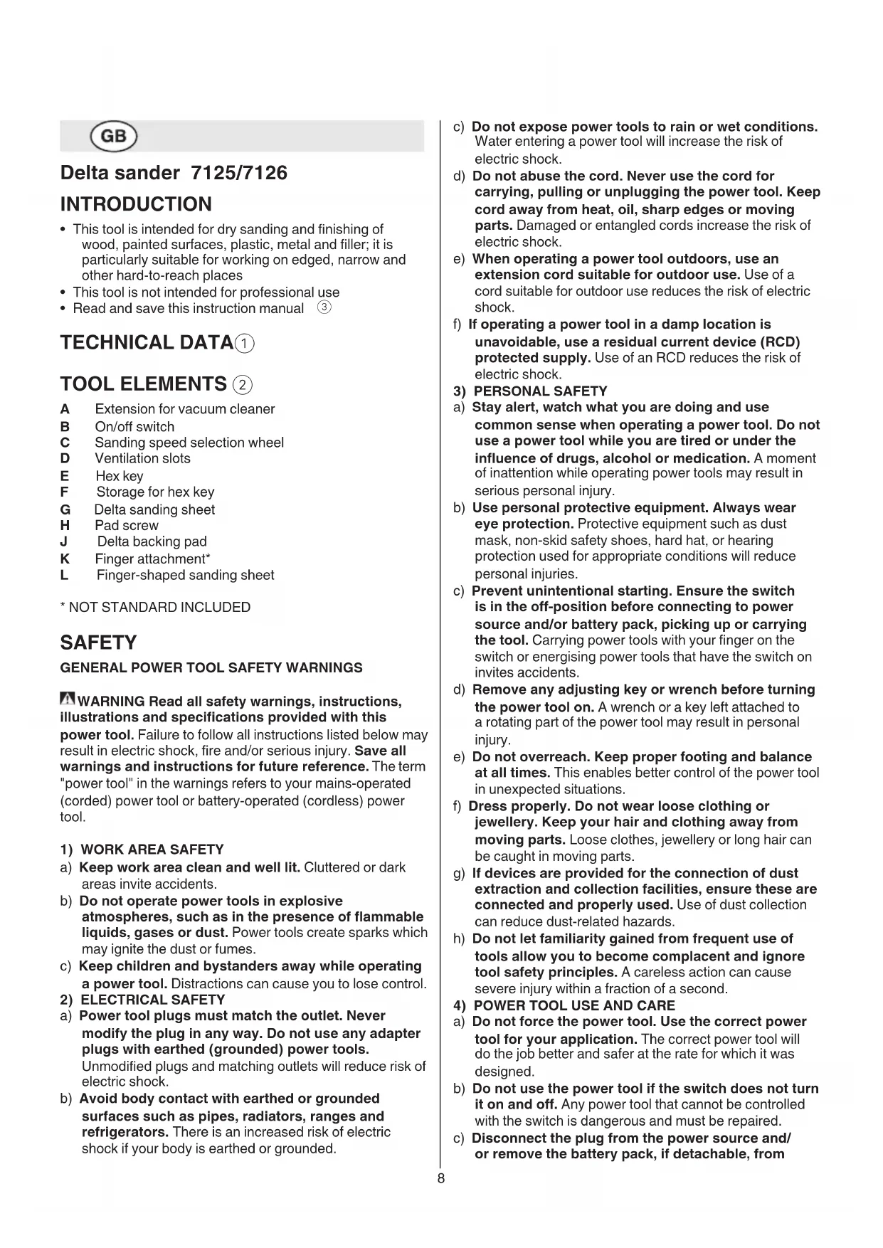 a) Do not force the power tool. Use the correct power tool for your application. The correct power tool will do the job better and safer at the rate for which it was designed. b) Do not use the power tool if the switch does not turn it on and o. Any power tool that cannot be controlled with the switch is dangerous and must be repaired. c) Disconnect the plug from the power source and/ or remove the battery pack, if detachable, from Delta sander 7125/7126 INTRODUCTION