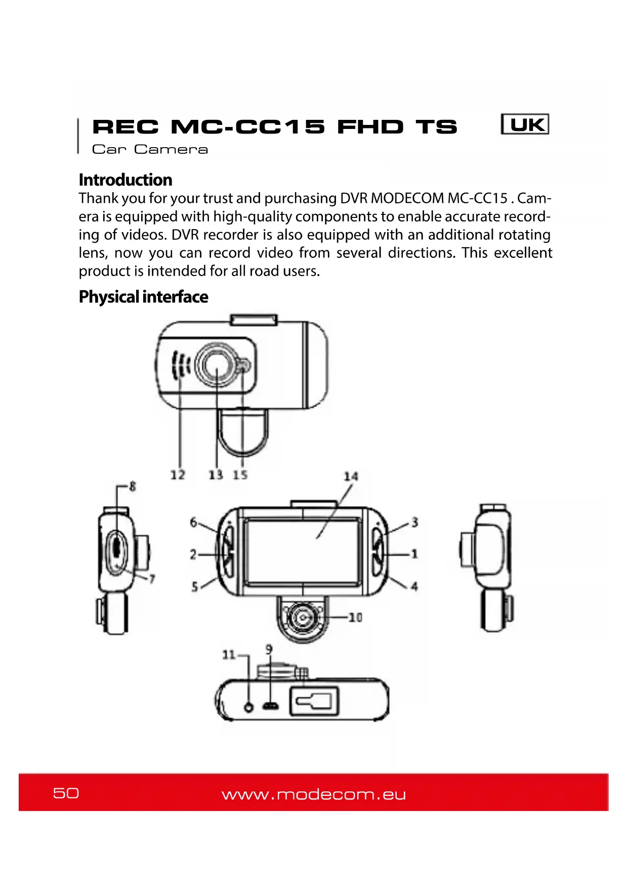 Thank you for your trust and purchasing DVR MODECOM MC-CC15. Camera is equipped with high-quality components to enable accurate recording of videos. DVR recorder is also equipped with an additional rotating lens, now you can record video from several directions. This excellent product is intended for all road users.