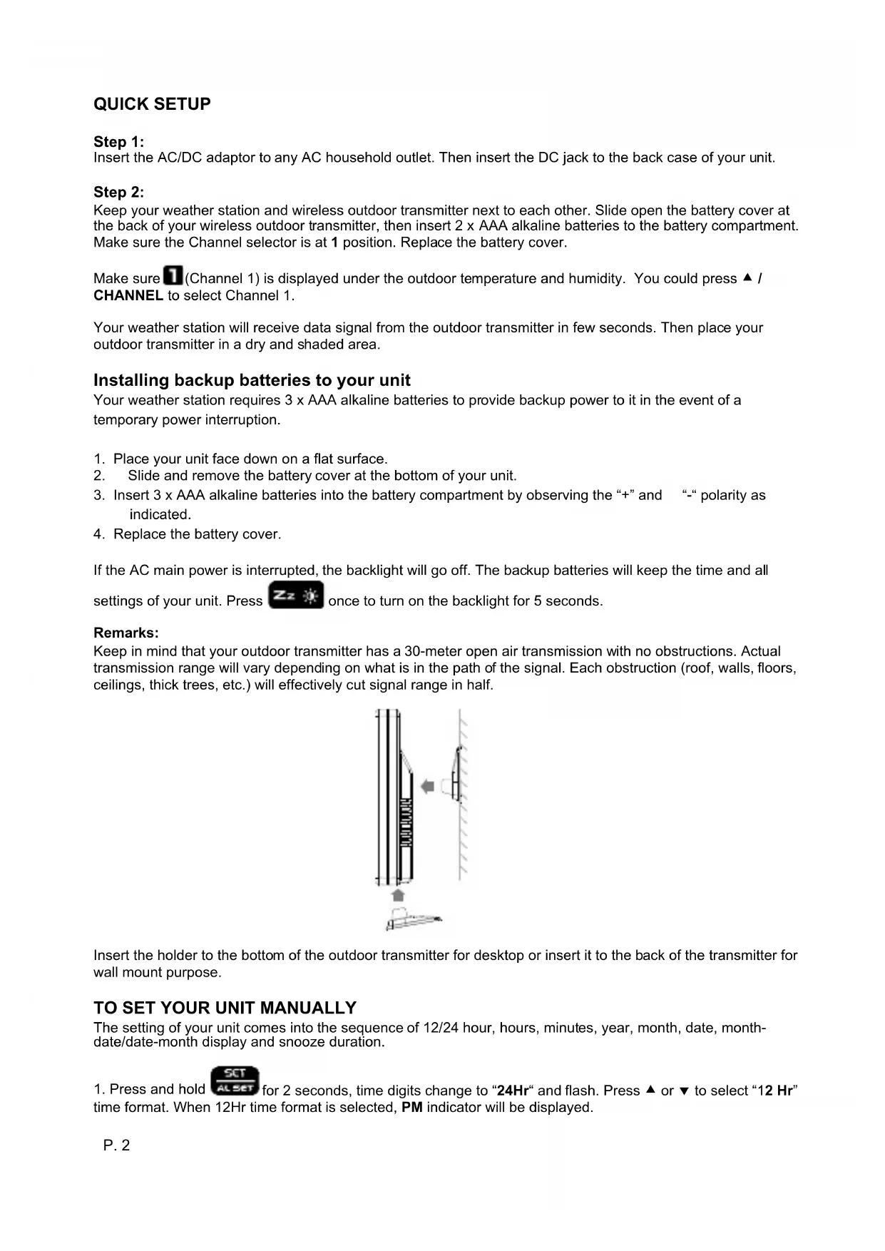 When the outdoor temperature and humidity digits show '--', the wireless transmission is either interrupted or lost. Press and hold the ▲ / CHANNEL button to start searching for the signal from the outdoor transmitter with the flashing.
