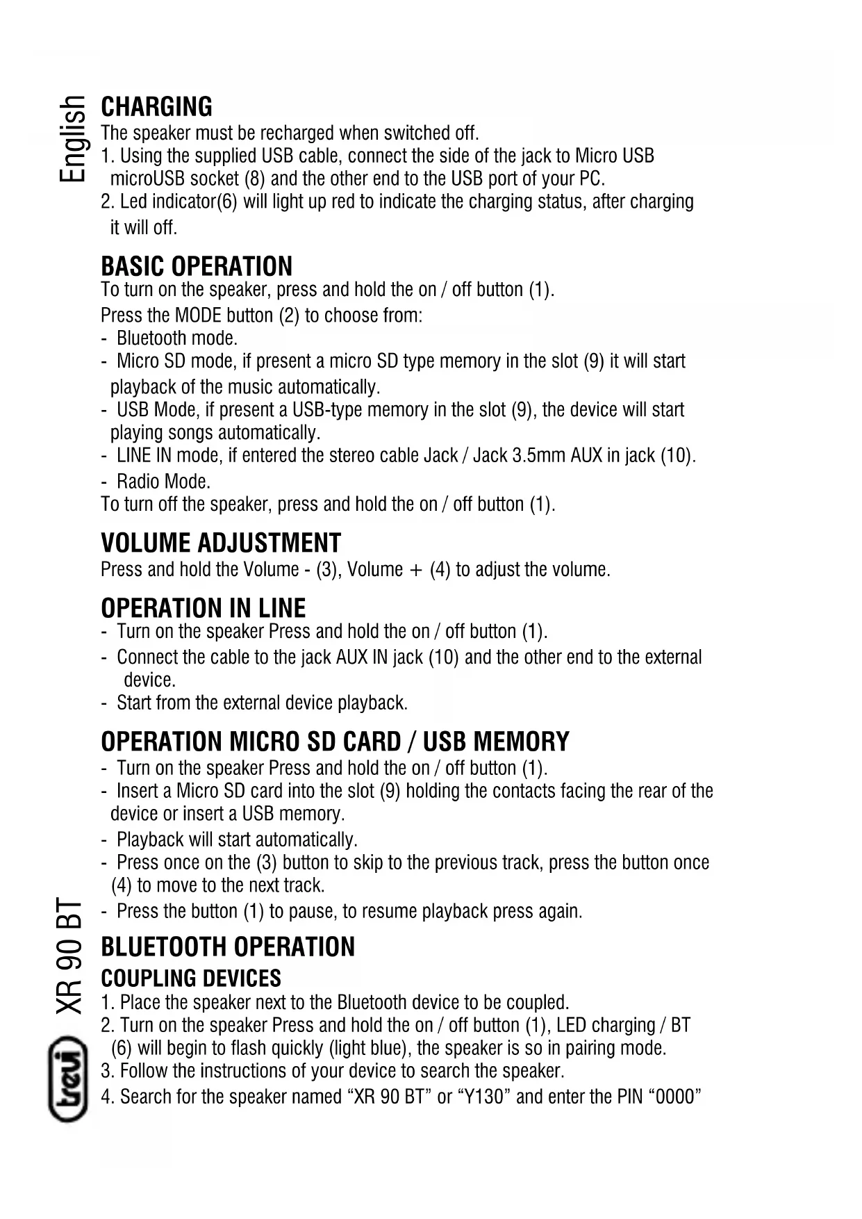 For cleaning it is recommended to use a soft, slightly damp cloth. Avoid solvents or abrasive substances. IMPORTANT The construction of this device guarantees long flawless operation. However, if come some problem, you should consult your nearest authorized service center. TREVI pursues a policy of continuous research and development. Therefore, the products may show different characteristics from those described. WARNING FOR A CORRECT USE OF RECHARGEABLE BATTERY - Recharge the battery in an ambient temperature between 5°C and 35°C. - Don’t recharge more than the suitable period to prevent the risk of overheating and burst. - Don’t recharge the battery for more than 4 hours. - Recharging the battery over the suitable period or an extended period of inactivity may reduce battery duration. - Rechargeable battery is liable to wear and tear and its performance will reduce gradually. - To extend the duration of the battery use it when is completely charged up to the complete discharging, then recharge it fully before use it again. Recharge a battery not completely consumed, will result a reduced duration. In this case, repeat the full charging/discharging cycle many times. - Avoid recharge the battery for the whole night. EnglishXR 90 BT English