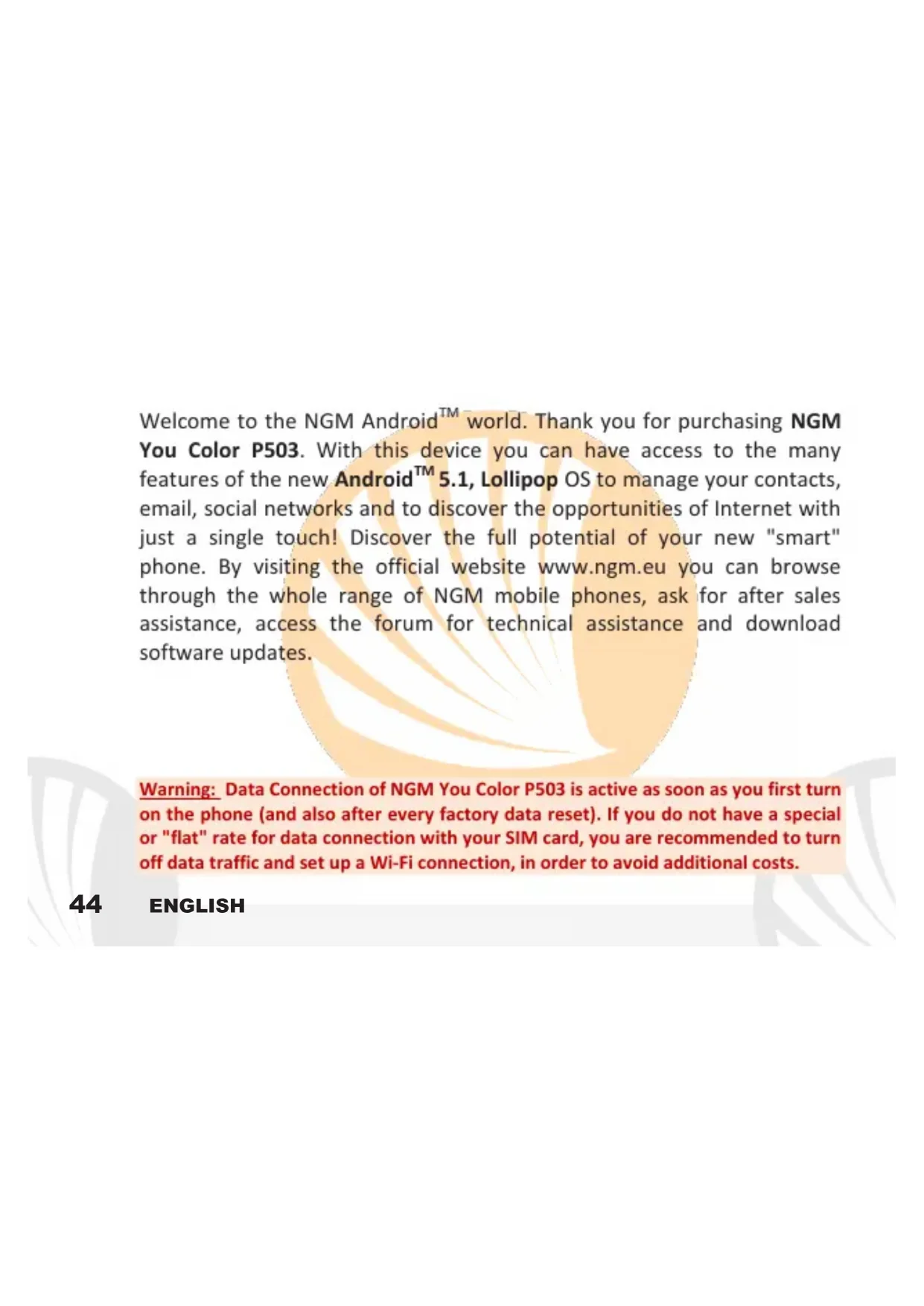 Welcome to the NGM Android™ world. Thank you for purchasing NGM You Color P503. With this device you can have access to the many features of the new Android™ 5.1, Lollipop OS to manage your contacts, email, social networks and to discover the opportunities of Internet with just a single touch! Discover the full potential of your new "smart" phone. By visiting the official website www.ngm.eu you can browse through the whole range of NGM mobile phones, ask for after sales assistance, access the forum for technical assistance and download software updates.