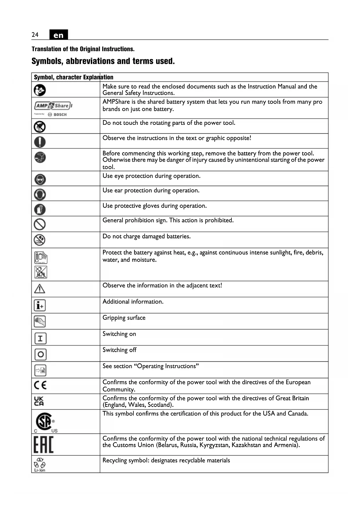 | EAC | Confirms the conformity of the power tool with the national technical regulations of the Customs Union (Belarus, Russia, Kyrgyzstan, Kazakhstan and Armenia). |