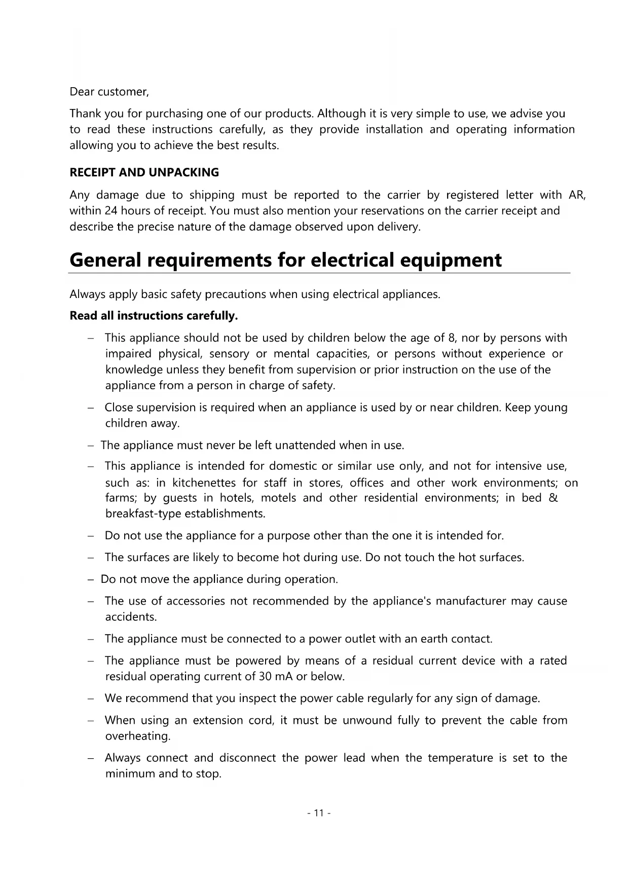 - This appliance should not be used by children below the age of 8, nor by persons with impaired physical, sensory or mental capacities, or persons without experience or knowledge unless they benefit from supervision or prior instruction on the use of the appliance from a person in charge of safety.