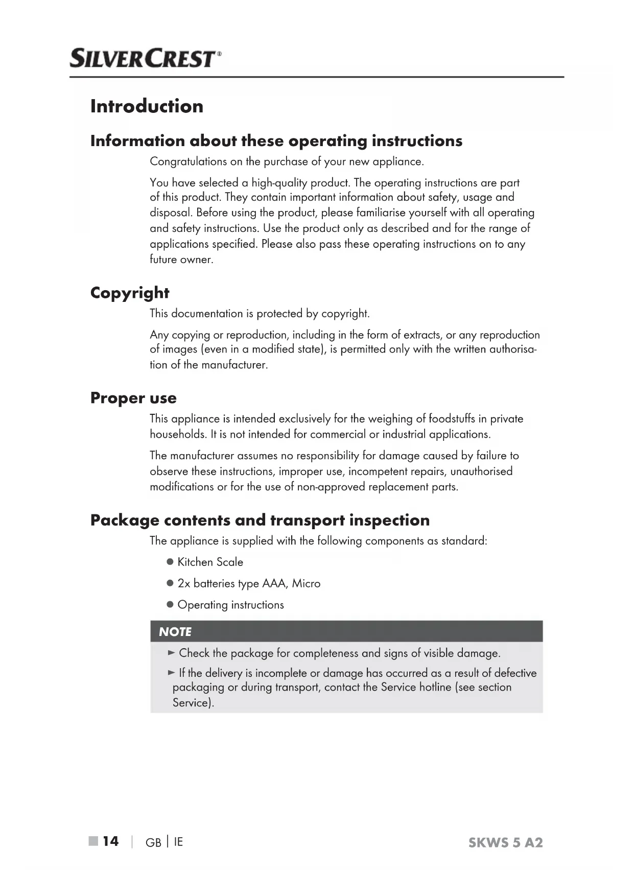 SKWS 5 A2 Introduction Information about these operating instructions Congratulations on the purchase of your new appliance. You have selected a high-quality product. The operating instructions are part of this product. They contain important information about safety, usage and disposal. Before using the product, please familiarise yourself with all operating and safety instructions. Use the product only as described and for the range of applications specified. Please also pass these operating instructions on to any future owner. Copyright This documentation is protected by copyright. Any copying or reproduction, including in the form of extracts, or any reproduction of images (even in a modified state), is permitted only with the written authorisa- tion of the manufacturer. Proper use This appliance is intended exclusively for the weighing of foodstuffs in private households. It is not intended for commercial or industrial applications. The manufacturer assumes no responsibility for damage caused by failure to observe these instructions, improper use, incompetent repairs, unauthorised modifications or for the use of non-approved replacement parts. Package contents and transport inspection The appliance is supplied with the following components as standard: ● Kitchen Scale ● 2x batteries type AAA, Micro ● Operating instructions NOTE ► Check the package for completeness and signs of visible damage. ► If the delivery is incomplete or damage has occurred as a result of defective packaging or during transport, contact the Service hotline (see section Service).GB