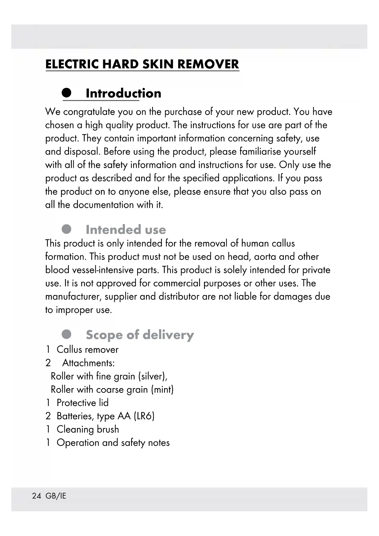 Introduction We congratulate you on the purchase of your new product. You have chosen a high quality product. The instructions for use are part of the product. They contain important information concerning safety, use and disposal. Before using the product, please familiarise yourself with all of the safety information and instructions for use. Only use the product as described and for the specified applications. If you pass the product on to anyone else, please ensure that you also pass on all the documentation with it. Intended use This product is only intended for the removal of human callus formation. This product must not be used on head, aorta and other blood vessel-intensive parts. This product is solely intended for private use. It is not approved for commercial purposes or other uses. The manufacturer, supplier and distributor are not liable for damages due to improper use. Scope of delivery 1 Callus remover 2 Attachments: Roller with fine grain (silver), Roller with coarse grain (mint) 1 Protective lid 2 Batteries, type AA (LR6) 1 Cleaning brush 1 Operation and safety notes25 GB/IE Parts description