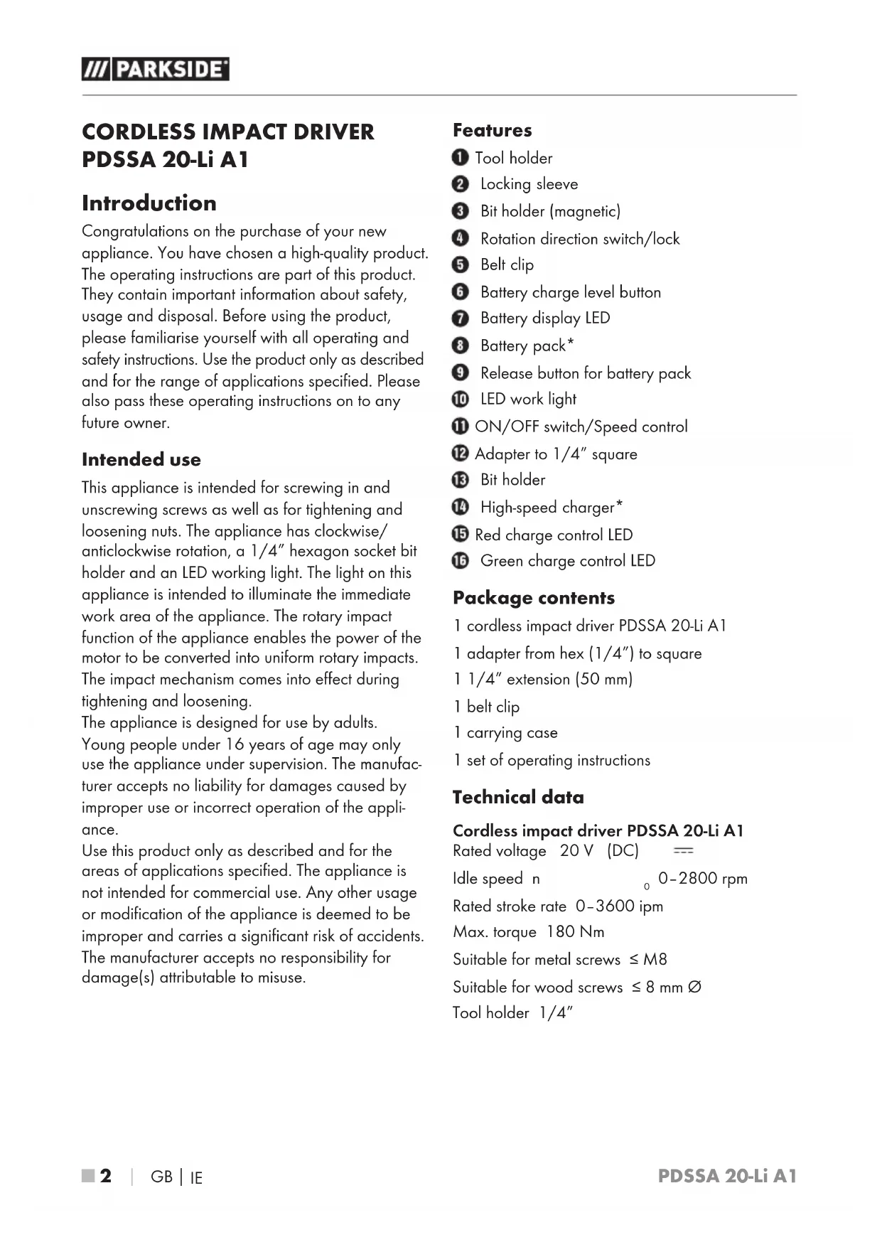 PDSSA 20-Li A1 Introduction Congratulations on the purchase of your new appliance. You have chosen a high-quality product. The operating instructions are part of this product. They contain important information about safety, usage and disposal. Before using the product, please familiarise yourself with all operating and safety instructions. Use the product only as described and for the range of applications specified. Please also pass these operating instructions on to any future owner. Intended use This appliance is intended for screwing in and unscrewing screws as well as for tightening and loosening nuts. The appliance has clockwise/ anticlockwise rotation, a 1/4” hexagon socket bit holder and an LED working light. The light on this appliance is intended to illuminate the immediate work area of the appliance. The rotary impact function of the appliance enables the power of the motor to be converted into uniform rotary impacts. The impact mechanism comes into effect during tightening and loosening. The appliance is designed for use by adults. Young people under 16 years of age may only use the appliance under supervision. The manufac- turer accepts no liability for damages caused by improper use or incorrect operation of the appli- ance. Use this product only as described and for the areas of applications specified. The appliance is not intended for commercial use. Any other usage or modification of the appliance is deemed to be improper and carries a significant risk of accidents. The manufacturer accepts no responsibility for damage(s) attributable to misuse. Features Tool holder Locking sleeve Bit holder (magnetic) Rotation direction switch/lock Belt clip Battery charge level button Battery display LED Battery pack* Release button for battery pack LED work light ON/OFF switch/Speed control Adapter to 1/4” square Bit holder High-speed charger* Red charge control LED Green charge control LED Package contents 1 cordless impact driver PDSSA 20-Li A1 1 adapter from hex (1/4”) to square 1 1/4” extension (50 mm) 1 belt clip 1 carrying case 1 set of operating instructions Technical data Cordless impact driver PDSSA 20-Li A1 Rated voltage 20 V (DC) Idle speed n