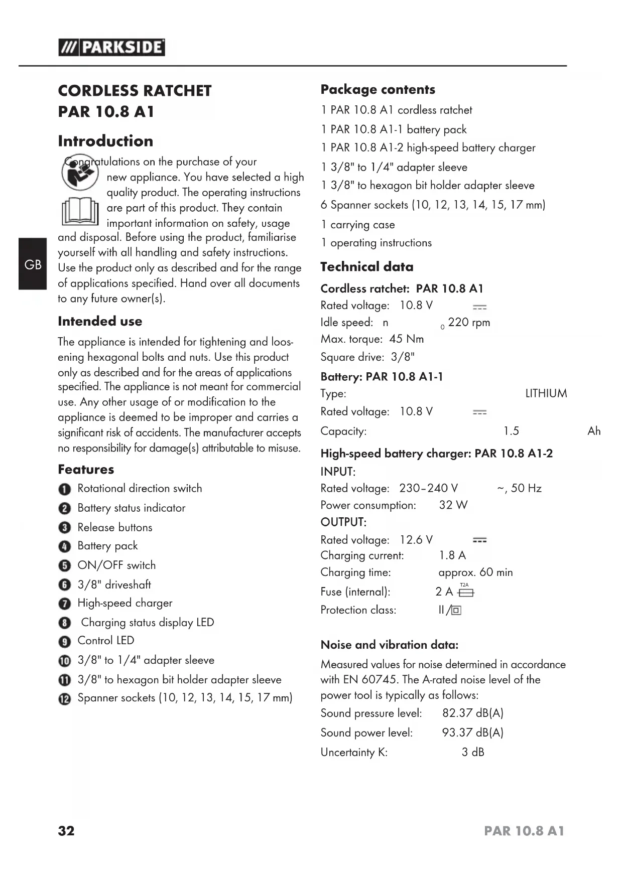 CORDLESS RATCHET PAR 10.8 A1 Introduction Congratulations on the purchase of your new appliance. You have selected a high quality product. The operating instructions are part of this product. They contain important information on safety, usage and disposal. Before using the product, familiarise yourself with all handling and safety instructions. Use the product only as described and for the range of applications specified. Hand over all documents to any future owner(s). Intended use The appliance is intended for tightening and loos- ening hexagonal bolts and nuts. Use this product only as described and for the areas of applications specified. The appliance is not meant for commercial use. Any other usage of or modification to the appliance is deemed to be improper and carries a significant risk of accidents. The manufacturer accepts no responsibility for damage(s) attributable to misuse. Features Rotational direction switch Battery status indicator Release buttons Battery pack ON/OFF switch 3/8" driveshaft High-speed charger Charging status display LED Control LED 3/8" to 1/4" adapter sleeve 3/8" to hexagon bit holder adapter sleeve Spanner sockets (10, 12, 13, 14, 15, 17 mm) Package contents 1 PAR 10.8 A1 cordless ratchet 1 PAR 10.8 A1-1 battery pack 1 PAR 10.8 A1-2 high-speed battery charger 1 3/8" to 1/4" adapter sleeve 1 3/8" to hexagon bit holder adapter sleeve 6 Spanner sockets (10, 12, 13, 14, 15, 17 mm) 1 carrying case 1 operating instructions Technical data Cordless ratchet: PAR 10.8 A1 Rated voltage: 10.8 V Idle speed: n