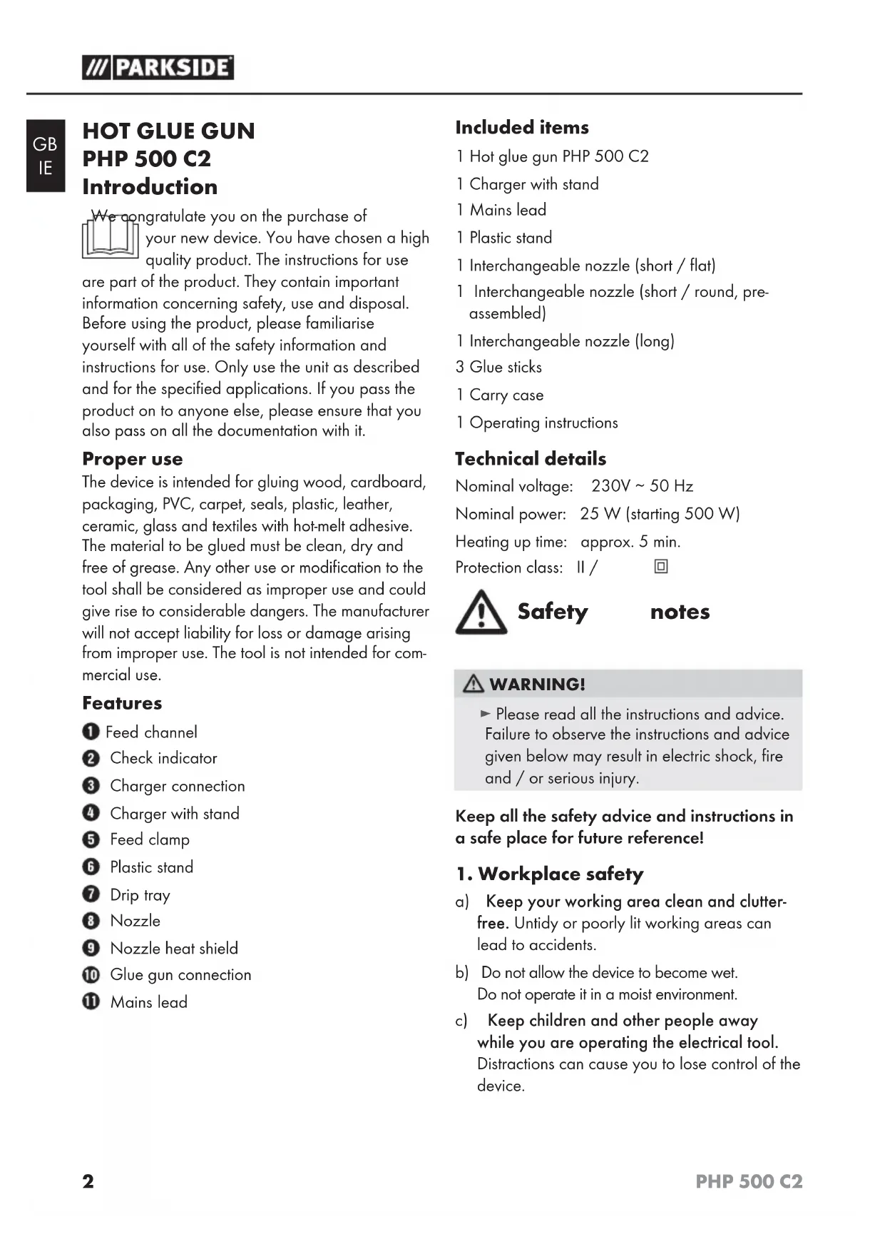 PHP 500 C2 Introduction We congratulate you on the purchase of your new device. You have chosen a high quality product. The instructions for use are part of the product. They contain important information concerning safety, use and disposal. Before using the product, please familiarise yourself with all of the safety information and instructions for use. Only use the unit as described and for the specified applications. If you pass the product on to anyone else, please ensure that you also pass on all the documentation with it. Proper use The device is intended for gluing wood, cardboard, packaging, PVC, carpet, seals, plastic, leather, ceramic, glass and textiles with hot-melt adhesive. The material to be glued must be clean, dry and free of grease. Any other use or modification to the tool shall be considered as improper use and could give rise to considerable dangers. The manufacturer will not accept liability for loss or damage arising from improper use. The tool is not intended for com- mercial use. Features Feed channel Check indicator Charger connection Charger with stand Feed clamp Plastic stand Drip tray Nozzle Nozzle heat shield Glue gun connection Mains lead Included items 1 Hot glue gun PHP 500 C2 1 Charger with stand 1 Mains lead 1 Plastic stand 1 Interchangeable nozzle (short / flat) 1 Interchangeable nozzle (short / round, pre- assembled) 1 Interchangeable nozzle (long) 3 Glue sticks 1 Carry case 1 Operating instructions Technical details Nominal voltage: 230V ∼ 50 Hz Nominal power: 25 W (starting 500 W) Heating up time: approx. 5 min. Protection class: II / Safety notes WARNING! ► Please read all the instructions and advice. Failure to observe the instructions and advice given below may result in electric shock, fire and / or serious injury. Keep all the safety advice and instructions in a safe place for future reference!