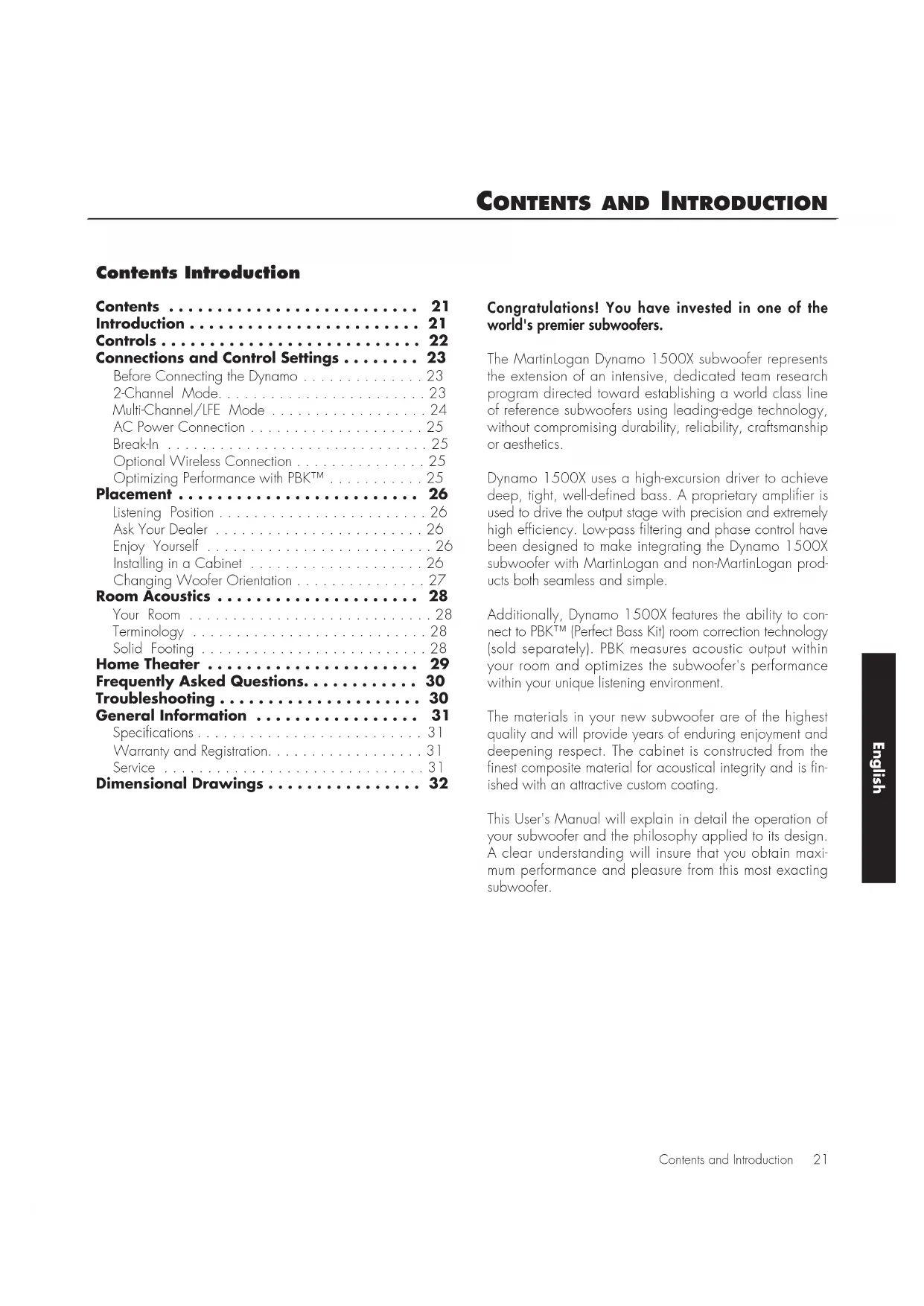 - Dimensional Drawings Congratulations! You have invested in one of the world's premier subwoofers. The MartinLogan Dynamo 1500X subwoofer represents the extension of an intensive, dedicated team research program directed toward establishing a world class line of reference subwoofers using leading-edge technology, without compromising durability, reliability, craftsmanship or aesthetics. Dynamo 1500X uses a high-excursion driver to achieve deep, tight, well-defined bass. A proprietary amplifier is used to drive the output stage with precision and extremely high efficiency. Low-pass filtering and phase control have been designed to make integrating the Dynamo 1500X subwoofer with MartinLogan and non-MartinLogan prod- ucts both seamless and simple. Additionally, Dynamo 1500X features the ability to con- nect to PBK™ (Perfect Bass Kit) room correction technology (sold separately). PBK measures acoustic output within your room and optimizes the subwoofer's performance within your unique listening environment. The materials in your new subwoofer are of the highest quality and will provide years of enduring enjoyment and deepening respect. The cabinet is constructed from the finest composite material for acoustical integrity and is fin- ished with an attractive custom coating. This User's Manual will explain in detail the operation of your subwoofer and the philosophy applied to its design. A clear understanding will insure that you obtain maxi- mum performance and pleasure from this most exacting subwoofer. Contents Introduction English22 Controls Level Knob (fig. 1) Setting the level too high will cause the bass to seem bloat- ed and is the single most common cause of bad sounding subwoofers. A rule of thumb is that the subwoofer should not draw attention to itself, but should simply make the sys- tems low end seem more extended and accurate. Low Pass Filter Knob (fig. 1) When the subwoofer is connected in multi-channel mode (via LFE), the crossover switch should be set to 'Bypass' so that the low pass filter is not active and your processor handles the bass management. When connected in 2-channel mode (via left/right input), as a general rule the low pass filter should be set equal to approximately 70% of your speaker’s lowest frequency response. Remember, this is a general rule. We advise that once you try the recommended setting using the for- mula above, you should try the surrounding settings to see which sounds best. Phase Control Knob (fig. 1) The phase control is entirely dependent on the size and configuration of your listening environment, the placement of the unit, and your seating arrangement. Due to the way bass sound waves develop in different rooms, there is no rule of thumb for setting phase. For instance, if your room has a peak at the subwoofer crossover area, you may wish to set the phase so the actual acoustic outputs of the subwoofer and main speakers are out of phase. Experiment, try different settings and be patient. Status LED (fig. 1) When the status LED is blue, the subwoofer is on. The LED will be off when in standby or unplugged. Power Mode and Trigger Input (fig. 2) When set to 'Auto' the subwoofer will turn itself on when detecting an audio signal. After several minutes of inactiv- ity the subwoofer will put itself in standby mode. If you have an external source component (such as a receiver) with built in trigger controls, you may wish to turn the subwoofer on and off with this source. Connect a cable from the control component to your subwoofer and set this switch to 'Trigger'. Although this technology is com- monly referred to as a 12V trigger, the Dynamo 1500X will respond to any signal between 5–24V DC. Controls Figure 1. Dynamo 1500X controls. Figure 2. Dynamo 1500X controls and connections. EnglishConnections and Control Settings 23 MartinLogan's engineering and design team developed the Dynamo 1500X subwoofer for easy setup and system integration. Before beginning to connect your subwoofer, please review the controls discussed in the last section. An understanding of these will help speed you along as you connect and integrate your subwoofer with your system. All signal connections are done on the rear connections panel of the subwoofer. Make certain that all of your con- nections are tight. WARNING! Unplug your subwoofer before making or breaking any signal connections! 2-Channel Mode This setup is recommended if your subwoofer will be used in a 2-channel system with main speakers playing full range. If you will be using your system for both 2-channel and multi-channel listening we recommend connecting the subwoofer as recommended in 'Multi-Channel/LFE Mode' on the next page. Some modern receivers and processors allow users to route left and right channel low-frequen- cy information, in addition to discrete LFE information, through the LFE output. Signal Connection (see figure 3): 1 Connect the left and right outputs of your preamplifier to the left and right inputs using quality RCA intercon- nects. If your preamplifier only has one set of outputs you may need to obtain Y adapters from your dealer. Recommended Control Settings (see figure 4): p. 32