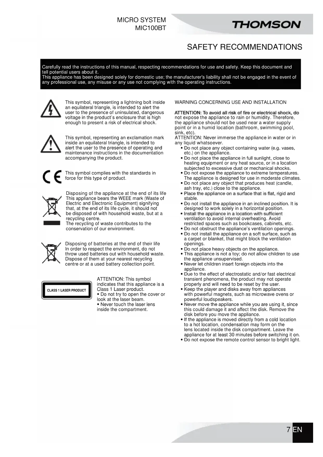 MICRO SYSTEM MIC100/MIC101 This symbol, representing a lightning bolt inside an equilateral triangle, is intended to alert the user to the presence of uninsulated, dangerous voltage in the product’s enclosure that is high enough to present a risk of electrical shock. Carefully read the instructions of this manual, respecting recommendations for use and safety. Keep this document and tell potential users about it. This appliance has been designed solely for domestic use; the manufacturer’s liability shall not be engaged in the event of any professional use, any misuse or any use not complying with the operating instructions. This symbol, representing an exclamation mark inside an equilateral triangle, is intended to alert the user to the presence of operating and maintenance instructions in the documentation accompanying the product. This symbol complies with the standards in force for this type of product. Disposing of the appliance at the end of its life This appliance bears the WEEE mark (Waste of Electric and Electronic Equipment) signifying that, at the end of its life cycle, it should not be disposed of with household waste, but at a recycling centre. The recycling of waste contributes to the conservation of our environment. Disposing of batteries at the end of their life In order to respect the environment, do not throw used batteries out with household waste. Dispose of them at your nearest recycling centre or at a used battery collection point. ATTENTION: This symbol indicates that this appliance is a Class 1 Laser product. pDo not try to open the cover or look at the laser beam. pNever touch the laser lens inside the compartment.