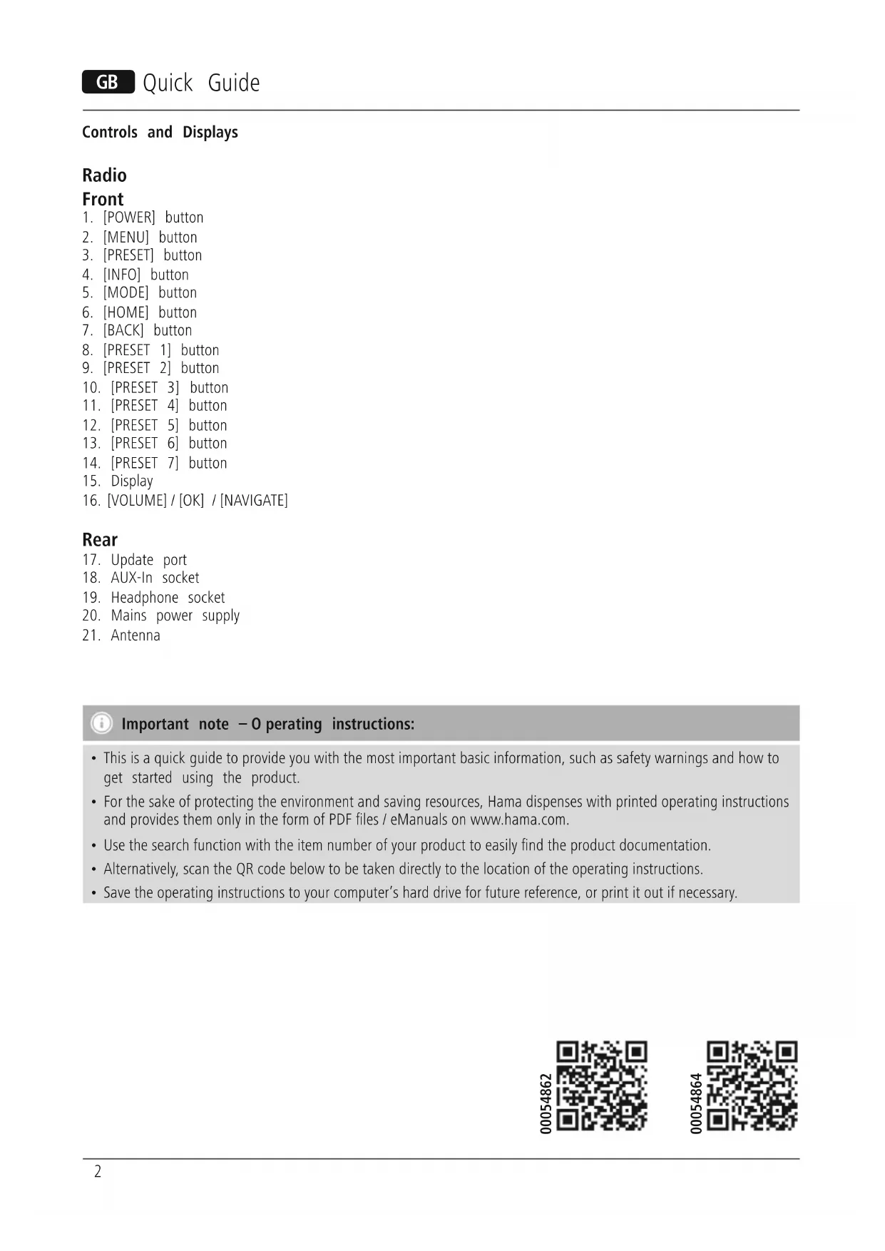 Hereby,Hama GmbH &CoKGdeclares that the radio equipment type [00054862, 00054864] is in compliance with Directive 2014/53/EU.The full text of the EU declaration of conformity is available at the following internet address: www.hama.com -