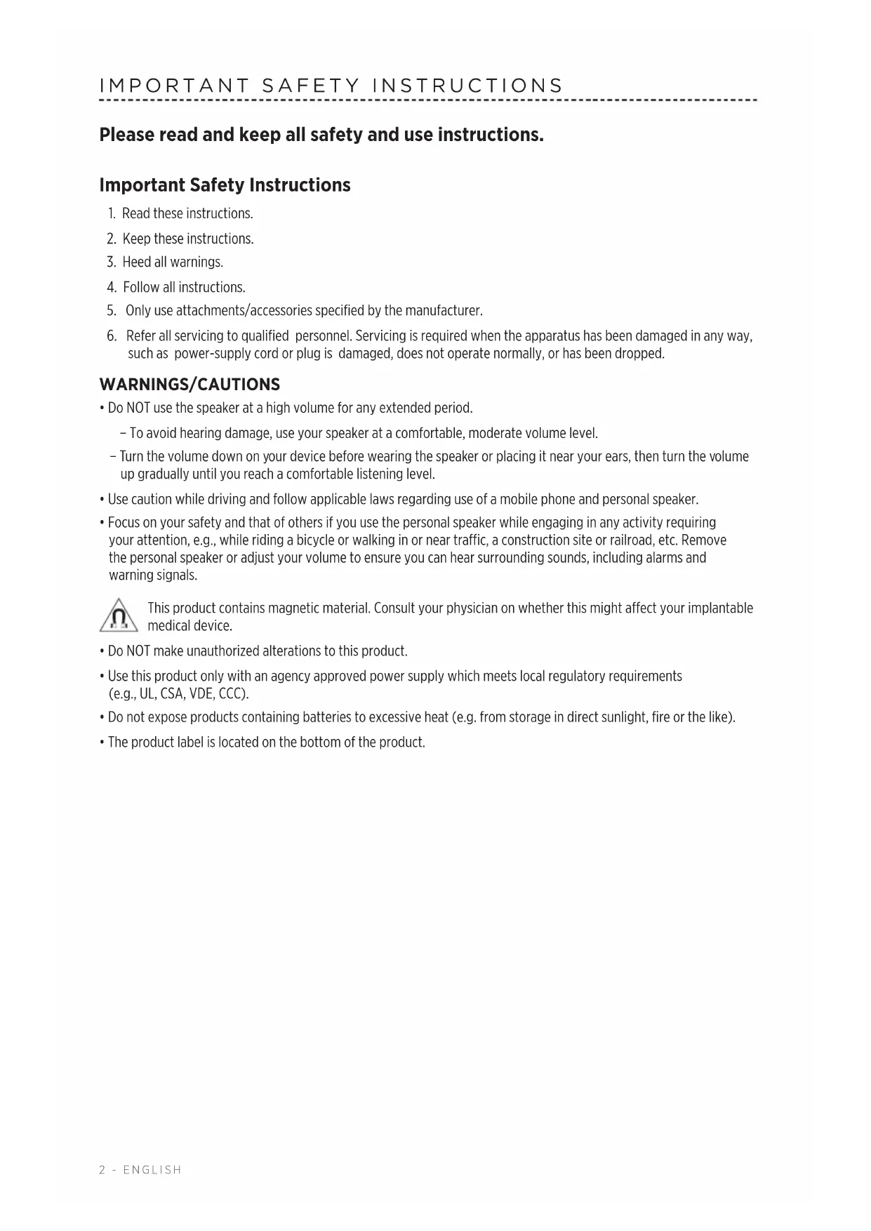 - Focus on your safety and that of others if you use the personal speaker while engaging in any activity requiring your attention, e.g., while riding a bicycle or walking in or near trac, a construction site or railroad, etc. Remove the personal speaker or adjust your volume to ensure you can hear surrounding sounds, including alarms and warning signals. This product contains magnetic material. Consult your physician on whether this might aect your implantable medical device.