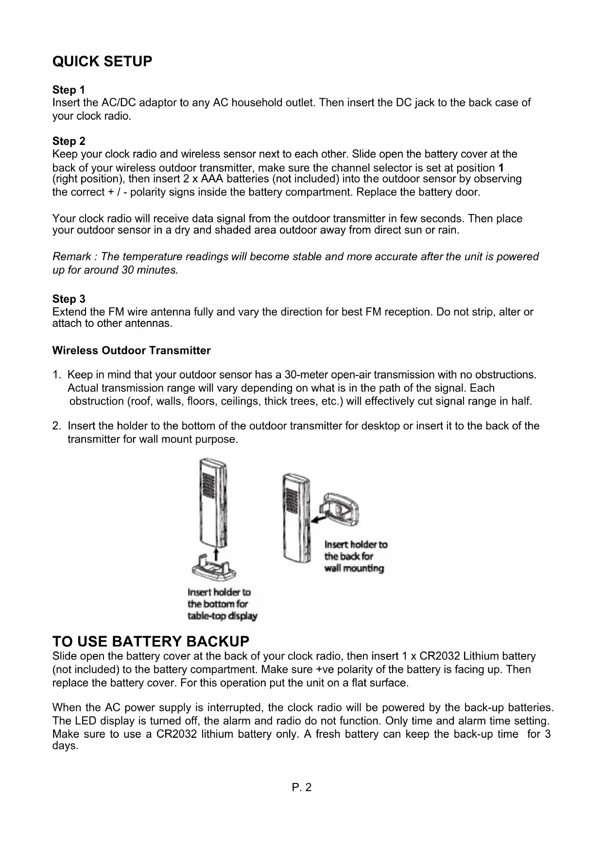 Your clock radio will receive data signal from the outdoor transmitter in few seconds. Then place your outdoor sensor in a dry and shaded area outdoor away from direct sun or rain.