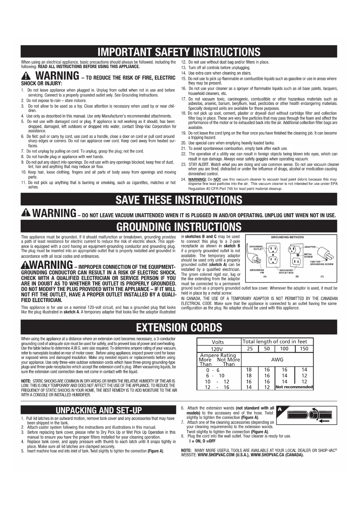 Insert machine hose end into inlet of tank. Twist slightly to tighten the connection (Figure A). When using the appliance at a distance where an extension cord becomes necessary, a 3-conductor grounding cord of adequate size must be used for safety, and to prevent loss of power and overheating. Use the table below to determine A.W.G. wire size required. To determine ampere rating of your vacuum, refer to nameplate located on rear of motor cover. Before using appliance, inspect power cord for loose or exposed wires and damaged insulation. Make any needed repairs or replacements before using your appliance. Use only three-wire outdoor extension cords which have three-prong grounding-type plugs and three-pole receptacles which accept the extension cord’s plug. When vacuuming liquids, be sure the extension cord connection does not come in contact with the liquid. NOTE: STATIC SHOCKS ARE COMMON IN DRY AREAS OR WHEN THE RELATIVE HUMIDITY OF THE AIR IS LOW. THIS IS ONLY TEMPORARY AND DOES NOT AFFECT THE USE OF THE APPLIANCE. TO REDUCE THE FREQUENCY OF STATIC SHOCKS IN YOUR HOME, THE BEST REMEDY IS TO ADD MOISTURE TO THE AIR WITH A CONSOLE OR INSTALLED HUMIDIFIER. EXTENSION CORDS When using an electrical appliance, basic precautions should always be followed, including the following: READ ALL INSTRUCTIONS BEFORE USING THIS APPLIANCE. WARNING – TO REDUCE THE RISK OF FIRE, ELECTRIC SHOCK OR INJURY: 1. Do not leave appliance when plugged in. Unplug from outlet when not in use and before servicing. Connect to a properly grounded outlet only. See Grounding Instructions.2. Do not expose to rain – store indoors.