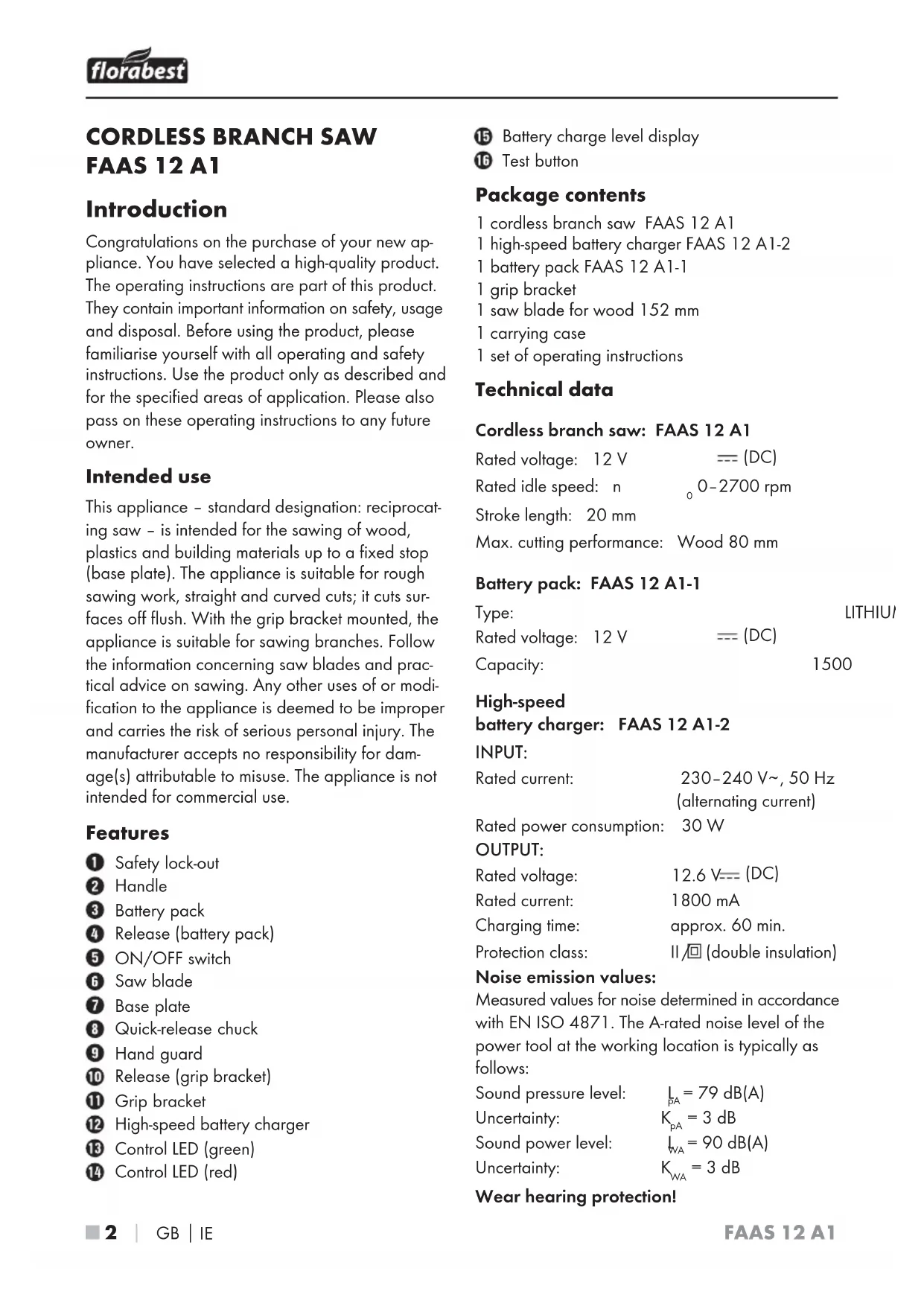 FAAS 12 A1 Introduction Congratulations on the purchase of your new ap- pliance. You have selected a high-quality product. The operating instructions are part of this product. They contain important information on safety, usage and disposal. Before using the product, please familiarise yourself with all operating and safety instructions. Use the product only as described and for the specified areas of application. Please also pass on these operating instructions to any future owner. Intended use This appliance – standard designation: reciprocat- ing saw – is intended for the sawing of wood, plastics and building materials up to a fixed stop (base plate). The appliance is suitable for rough sawing work, straight and curved cuts; it cuts sur- faces off flush. With the grip bracket mounted, the appliance is suitable for sawing branches. Follow the information concerning saw blades and prac- tical advice on sawing. Any other uses of or modi- fication to the appliance is deemed to be improper and carries the risk of serious personal injury. The manufacturer accepts no responsibility for dam- age(s) attributable to misuse. The appliance is not intended for commercial use. Features Safety lock-out Handle Battery pack Release (battery pack) ON/OFF switch Saw blade Base plate Quick-release chuck Hand guard Release (grip bracket) Grip bracket High-speed battery charger Control LED (green) Control LED (red) Battery charge level display Test button Package contents 1 cordless branch saw FAAS 12 A1 1 high-speed battery charger FAAS 12 A1-2 1 battery pack FAAS 12 A1-1 1 grip bracket 1 saw blade for wood 152 mm 1 carrying case 1 set of operating instructions Technical data Cordless branch saw: FAAS 12 A1 Rated voltage: 12 V (DC) Rated idle speed: n
