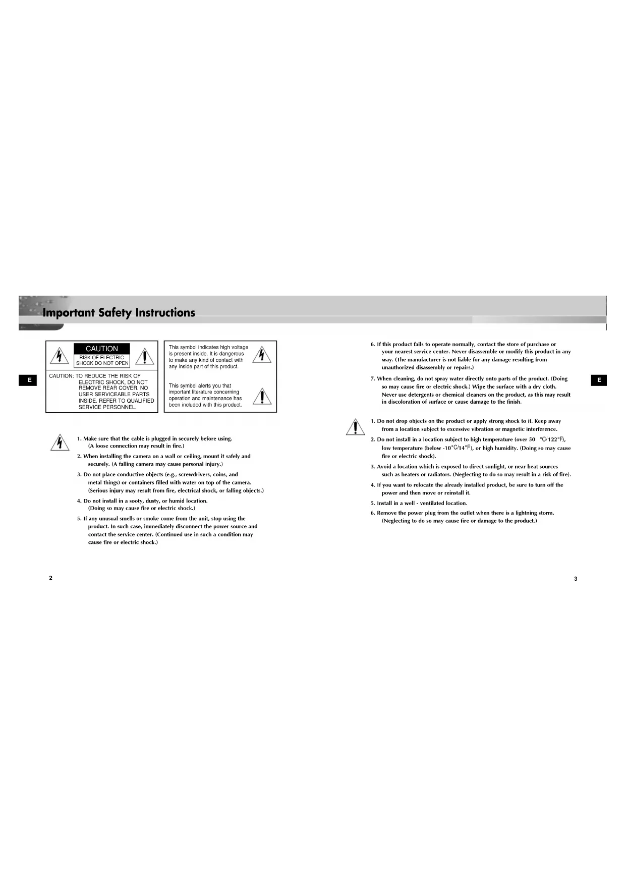 product. In such case, immediately disconnect the power source and contact the service center. (Continued use in such a condition may cause fire or electric shock.) This symbol indicates high voltageis present inside. It is dangerousto make any kind of contact withany inside part of this product.This symbol alerts you thatimportant literature concerningoperation and maintenance hasbeen included with this product. CAUTION RISK OF ELECTRIC SHOCK DO NOT OPEN 00351A SOC-920P-eng 11/19/03 3:15 PM Page 2E