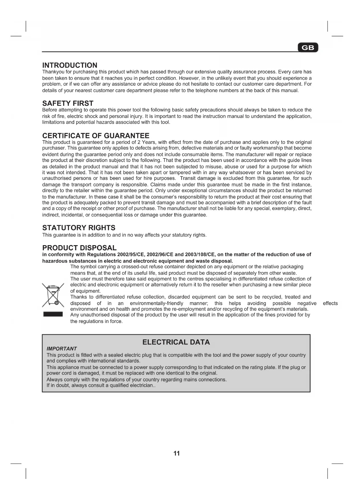 This product is guaranteed for a period of 2 Years, with effect from the date of purchase and applies only to the original purchaser. This guarantee only applies to defects arising from, defective materials and or faulty workmanship that become evident during the guarantee period only and does not include consumable items. The manufacturer will repair or replace the product at their discretion subject to the following. That the product has been used in accordance with the guide lines as detailed in the product manual and that it has not been subjected to misuse, abuse or used for a purpose for which it was not intended. That it has not been taken apart or tampered with in any way whatsoever or has been serviced by unauthorised persons or has been used for hire purposes. Transit damage is excluded from this guarantee, for such damage the transport company is responsible. Claims made under this guarantee must be made in the first instance, directly to the retailer within the guarantee period. Only under exceptional circumstances should the product be returned to the manufacturer. In these case it shall be the consumer’s responsibility to return the product at their cost ensuring that the product is adequately packed to prevent transit damage and must be accompanied with a brief description of the fault and a copy of the receipt or other proof of purchase. The manufacturer shall not be liable for any special, exemplary, direct, indirect, incidental, or consequential loss or damage under this guarantee. STATUTORY RIGHTS This guarantee is in addition to and in no way affects your statutory rights. PRODUCT DISPOSAL in conformity with Regulations 2002/95/CE, 2002/96/CE and 2003/108/CE, on the matter of the reduction of use of hazardous substances in electric and electronic equipment and waste disposal. Thesymbolcarryingacrossed-outrefusecontainerdepictedonanyequipmentortherelativepackaging means that, at the end of its useful life, said product must be disposed of separately from other waste. The user must therefore take said equipment to the centres specialising in differentiated refuse collection of electric and electronic equipment or alternatively return it to the reseller when purchasing a new similar piece of equipment. Thanks to differentiated refuse collection, discarded equipment can be sent to be recycled, treated and disposed of in an environmentally-friendly manner; this helps avoiding possible negative effects on the environmentandonhealthandpromotesthere-employmentand/orrecyclingoftheequipment’smaterials. Anyunauthoriseddisposaloftheproductbytheuserwillresultintheapplicationofthenesprovidedforby the regulations in force. ELECTRICAL DATA IMPORTANT This product is fitted with a sealed electric plug that is compatible with the tool and the power supply of your country and complies with international standards. This appliance must be connected to a power supply corresponding to that indicated on the rating plate. If the plug or power cord is damaged, it must be replaced with one identical to the original. Always comply with the regulations of your country regarding mains connections. If in doubt, always consult a qualified electrician..GB
