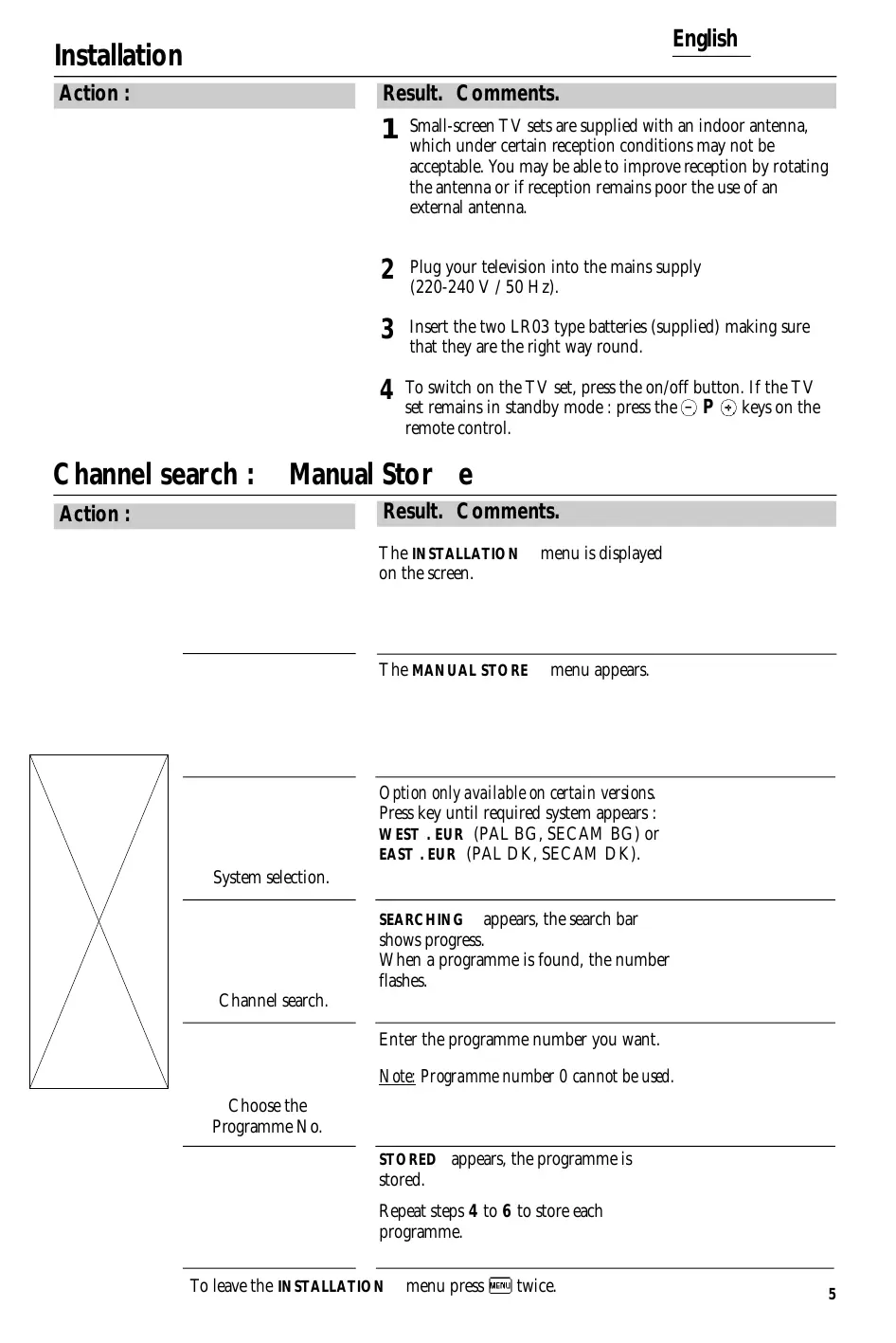 To switch on the TV set, press the on/off button. If the TV set remains in standby mode : press the P keys on the remote control. Manual Stor e Result. Comments. Action : The INSTALLATION on the screen. menu is displayed The MANUAL STORE menu appears. Option only available on certain versions. Press key until required system appears : WEST . EUR (PAL BG, SECAM BG) or EAST . EUR (PAL DK, SECAM DK). System selection. SEARCHING appears, the search bar shows progress. When a programme is found, the number flashes. Channel search. Enter the programme number you want. Note: Programme number 0 cannot be used. Choose the Programme No. STORED appears, the programme is stored. Repeat steps 4 to 6 to store each programme. To leave the INSTALLATION menu press twice.