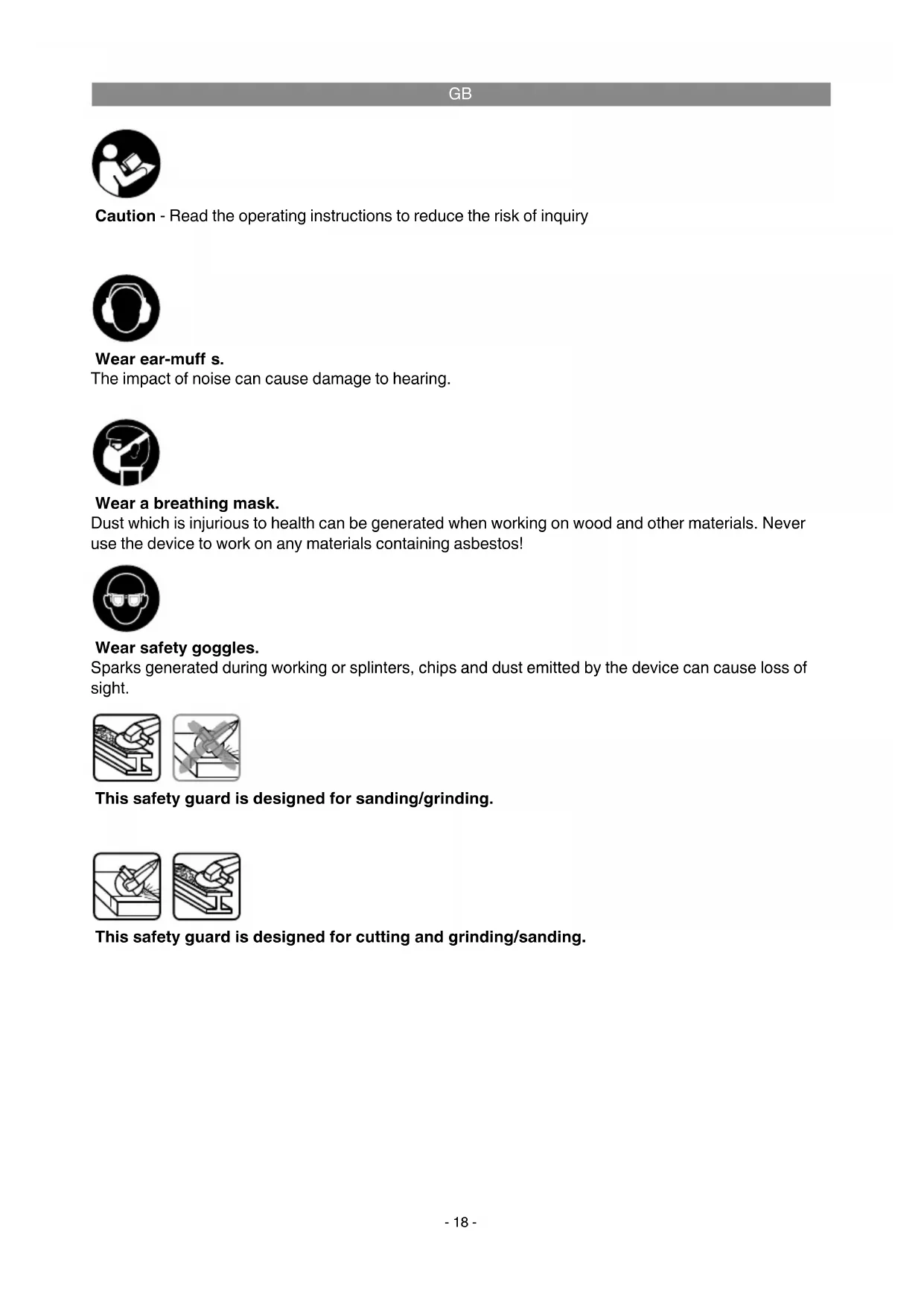Caution - Read the operating instructions to reduce the risk of inquiry Wear ear-muff s. The impact of noise can cause damage to hearing. Wear safety goggles. Sparks generated during working or splinters, chips and dust emitted by the device can cause loss of sight. Wear a breathing mask. Dust which is injurious to health can be generated when working on wood and other materials. Never use the device to work on any materials containing asbestos! This safety guard is designed for cutting and grinding/sanding. This safety guard is designed for sanding/grinding. Anl_TE_AG_125_750_Kit_SPK1.indb 18Anl_TE_AG_125_750_Kit_SPK1.indb 18 11.10.12 10:4811.10.12 10:48GB
