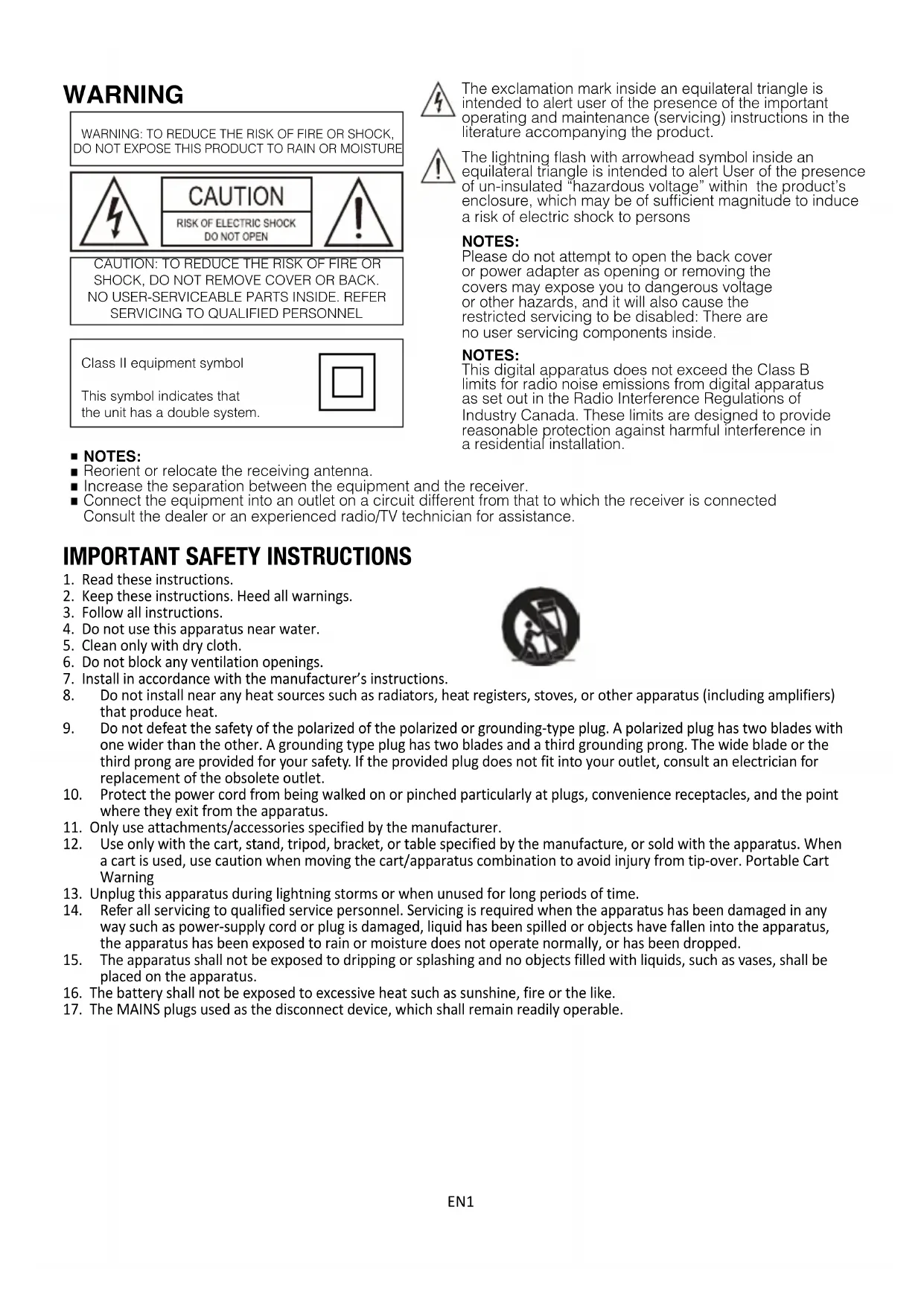 CAUTION: TO REDUCE THE RISK OF FIRE OR SHOCK, DO NOT REMOVE COVER OR BACK. NO USER-SERVICEABLE PARTS INSIDE. REFER SERVICING TO QUALIFIED PERSONNEL