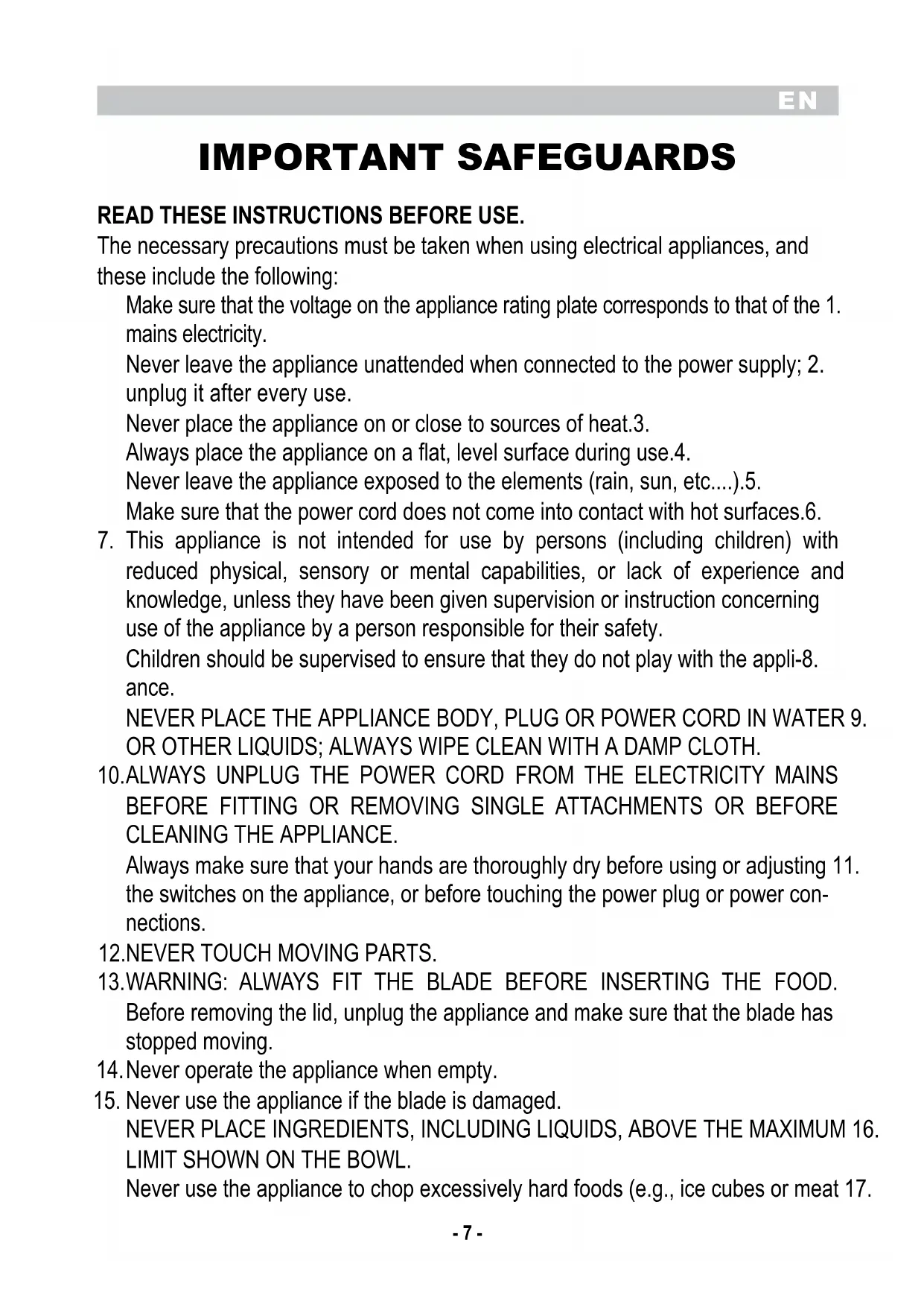 Before removing the lid, unplug the appliance and make sure that the blade has stopped moving. Never operate the appliance when empty.14. Never use the appliance if the blade is damaged.15. NEVER PLACE INGREDIENTS, INCLUDING LIQUIDS, ABOVE THE MAXIMUM 16. LIMIT SHOWN ON THE BOWL. Never use the appliance to chop excessively hard foods (e.g., ice cubes or meat 17.EN