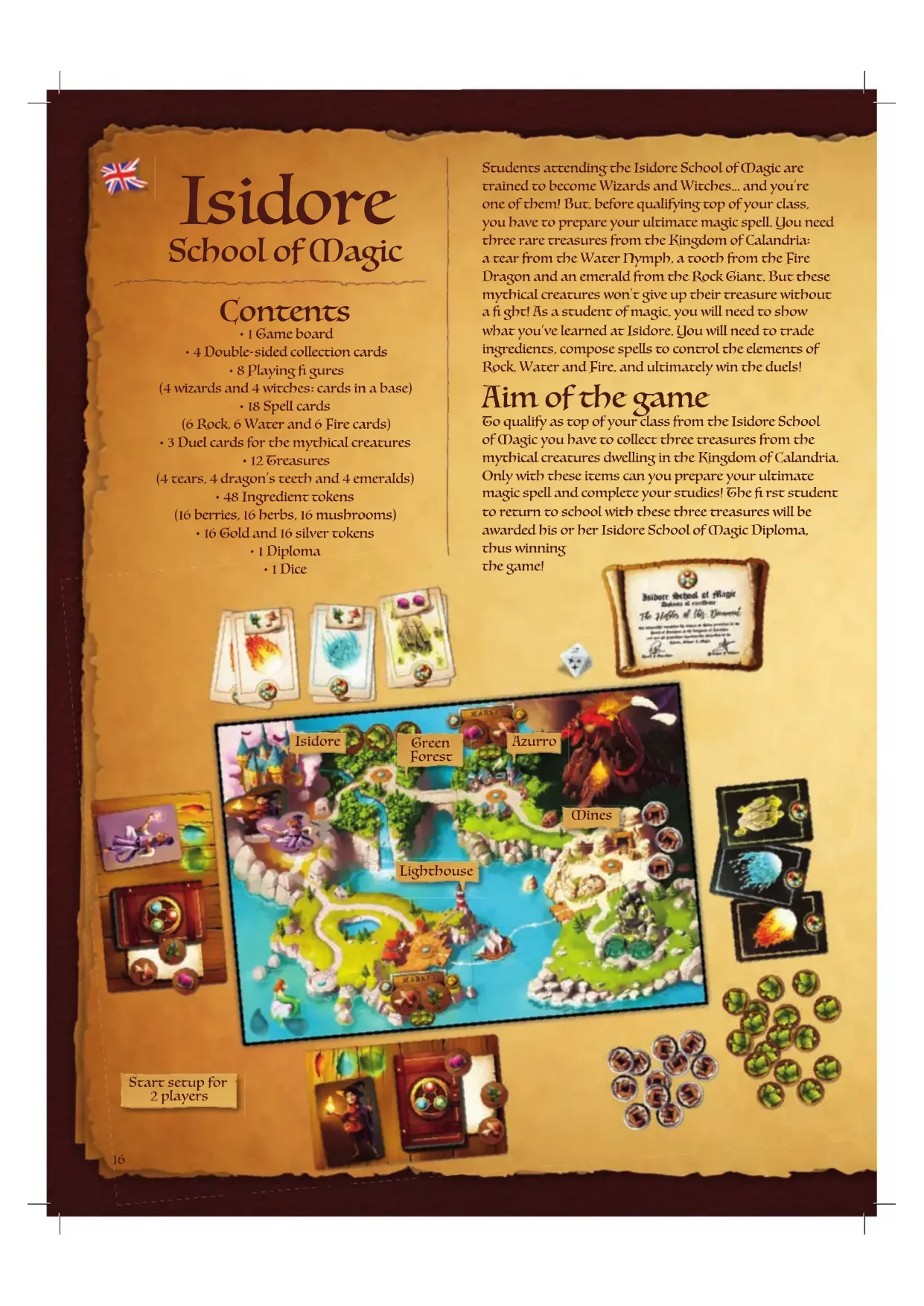 - 1 Dice Students attending the Isidore School of Magic are trained to become Wizards and Witches... and you’re one of them! But, before qualifying top of your class, you have to prepare your ultimate magic spell. You need three rare treasures from the Kingdom of Calandria: a tear from the Water Nymph, a tooth from the Fire Dragon and an emerald from the Rock Giant. But these mythical creatures won’t give up their treasure without a fi ght! As a student of magic, you will need to show what you’ve learned at Isidore. You will need to trade ingredients, compose spells to control the elements of Rock, Water and Fire, and ultimately win the duels! Aim of the game To qualify as top of your class from the Isidore School of Magic you have to collect three treasures from the mythical creatures dwelling in the Kingdom of Calandria. Only with these items can you prepare your ultimate magic spell and complete your studies! The fi rst student to return to school with these three treasures will be awarded his or her Isidore School of Magic Diploma, thus winning the game! 16Preparations