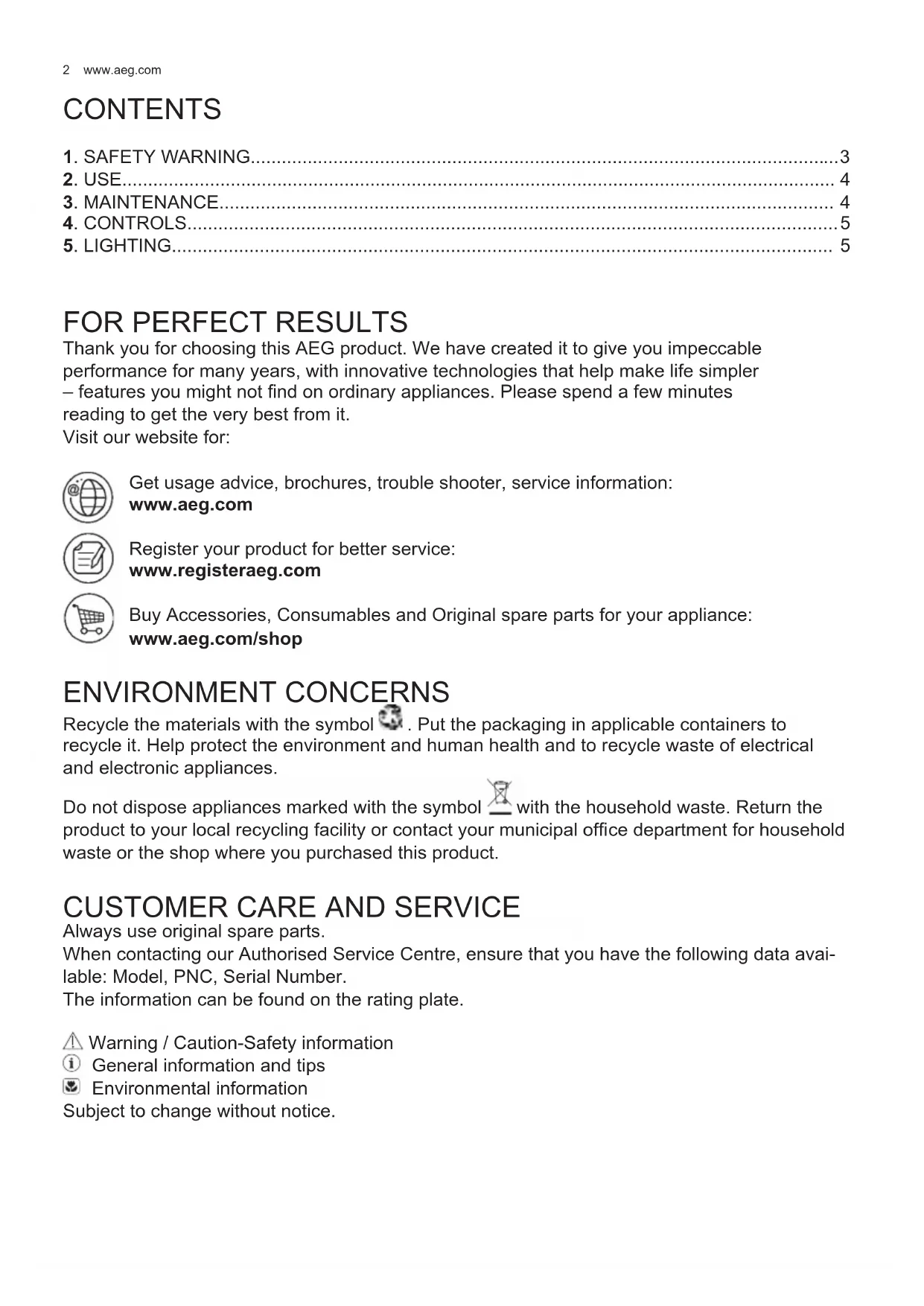 Thank you for choosing this AEG product. We have created it to give you impeccable performance for many years, with innovative technologies that help make life simpler – features you might not fi nd on ordinary appliances. Please spend a few minutes reading to get the very best from it. Visit our website for: Get usage advice, brochures, trouble shooter, service information: www.aeg.com Register your product for better service: www.registeraeg.com Buy Accessories, Consumables and Original spare parts for your appliance: www.aeg.com/shop ENVIRONMENT CONCERNS Recycle the materials with the symbol . Put the packaging in applicable containers to recycle it. Help protect the environment and human health and to recycle waste of electrical and electronic appliances. Do not dispose appliances marked with the symbol with the household waste. Return the product to your local recycling facility or contact your municipal offi ce department for household waste or the shop where you purchased this product.