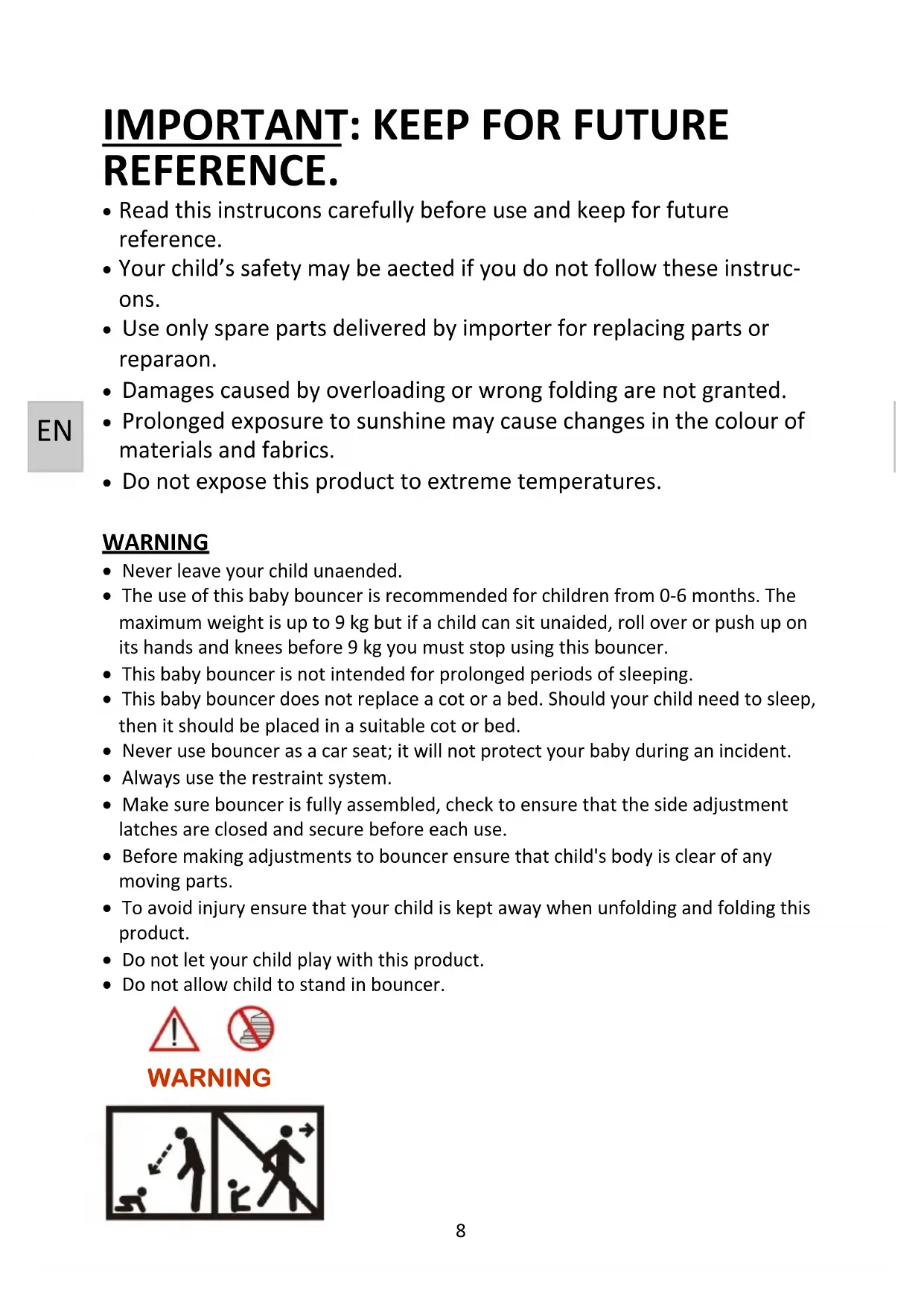 - Do not connue using bouncer if it becomes bent, broken or if the clothe cover is ripped or torn.