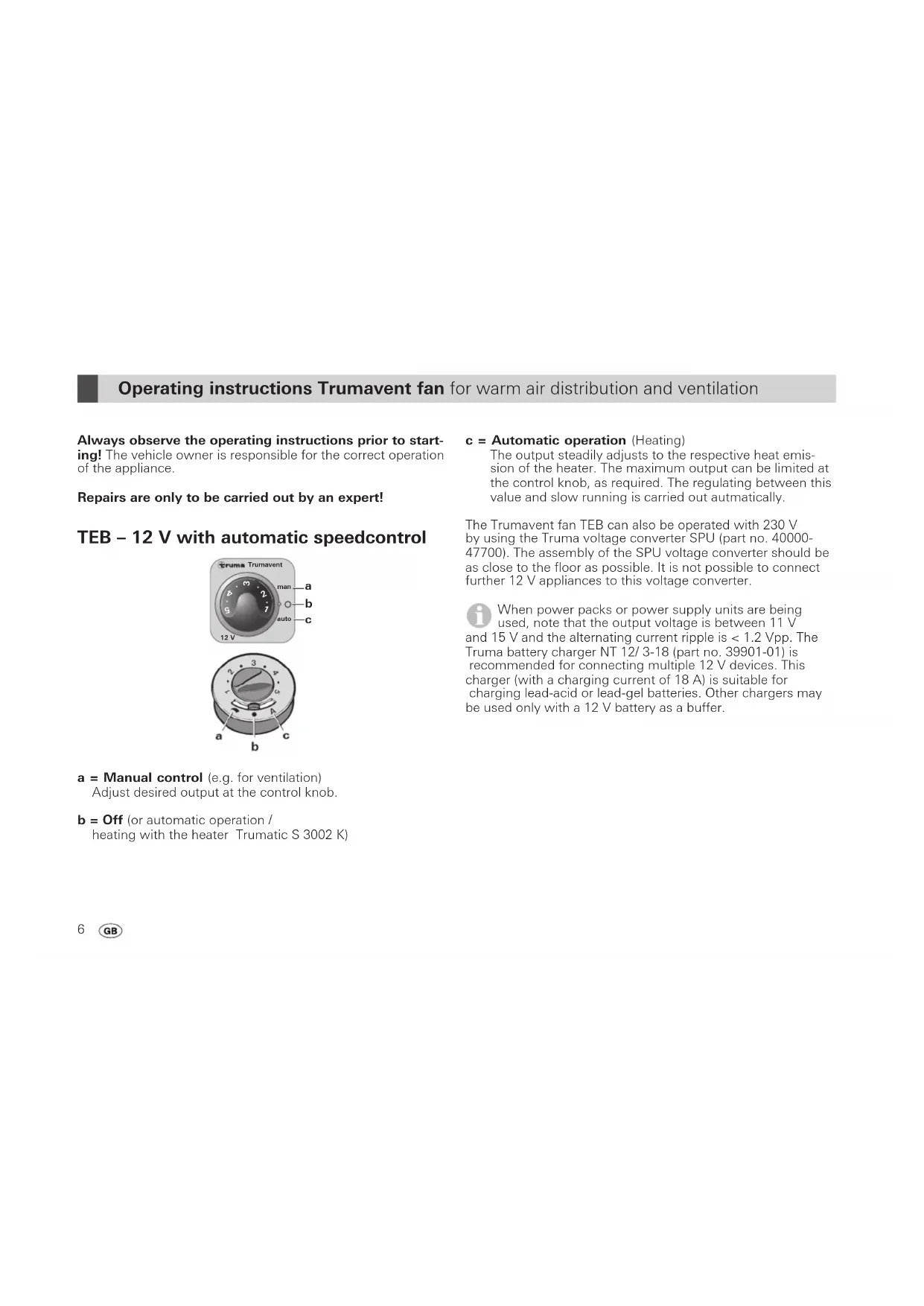 d = Off e = On Adjust required output at control knob. Prior to maintenance or repair work always discon- nect the Trumavent fan in all poles from the power supply with at least 3.5 mm contact clearance! The Trumavent TN – 230 V fan and the SPU voltage converter must not be used in vehicles whilst driving. Warm air distribution The warm air system is designed individually for each type of vehicle on a modular basis. There is an extensive expansion programme available with accessories for retrofitting (see brochure). You can obtain diagrams free of charge from the Truma Service Centre, showing optimal installation suggestions for warm air systems in all current-type caravans and mobile homes. The quantity of air can be individually adjusted at the air flap (f), for warm air distribution. In centre position 50 % of the warm air is distributed to each outlet. Use the fan duct with dia. 72 mm if the fan ducts are of differ- ent lengths or on sides with a greater heat requirement. This means that the air output can be used to the full on this side. By adjusting the air flap (f) the quantity of air can be increased individually. This means that the air output on the other side is reduced. If the air output drops or the operating noise increases, the fan impeller wheel may be severely soiled. Cleaning (with switched off appliance!) We recommend removing dust which has collected on the heat exchanger and base plate of the heater and on the impel- ler wheel of the Trumavent fan, once a year, before the heat- ing season starts. Clean the impeller wheel carefully using a brush or tooth brush.8 Technical data determined in accordance with EN 624 or Truma test conditions Trumavent TEB – 12 V Power supply 12 V DC Power consumption