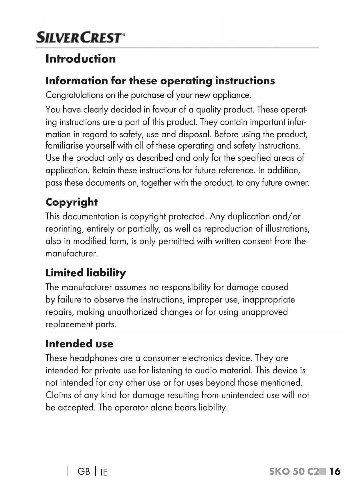 Introduction Information for these operating instructions Congratulations on the purchase of your new appliance. You have clearly decided in favour of a quality product. These operat- ing instructions are a part of this product. They contain important infor- mation in regard to safety, use and disposal. Before using the product, familiarise yourself with all of these operating and safety instructions. Use the product only as described and only for the specified areas of application. Retain these instructions for future reference. In addition, pass these documents on, together with the product, to any future owner. Copyright This documentation is copyright protected. Any duplication and/or reprinting, entirely or partially, as well as reproduction of illustrations, also in modified form, is only permitted with written consent from the manufacturer. Limited liability The manufacturer assumes no responsibility for damage caused by failure to observe the instructions, improper use, inappropriate repairs, making unauthorized changes or for using unapproved replacement parts. Intended use These headphones are a consumer electronics device. They are intended for private use for listening to audio material. This device is not intended for any other use or for uses beyond those mentioned. Claims of any kind for damage resulting from unintended use will not be accepted. The operator alone bears liability.SKO 50 C2 GB