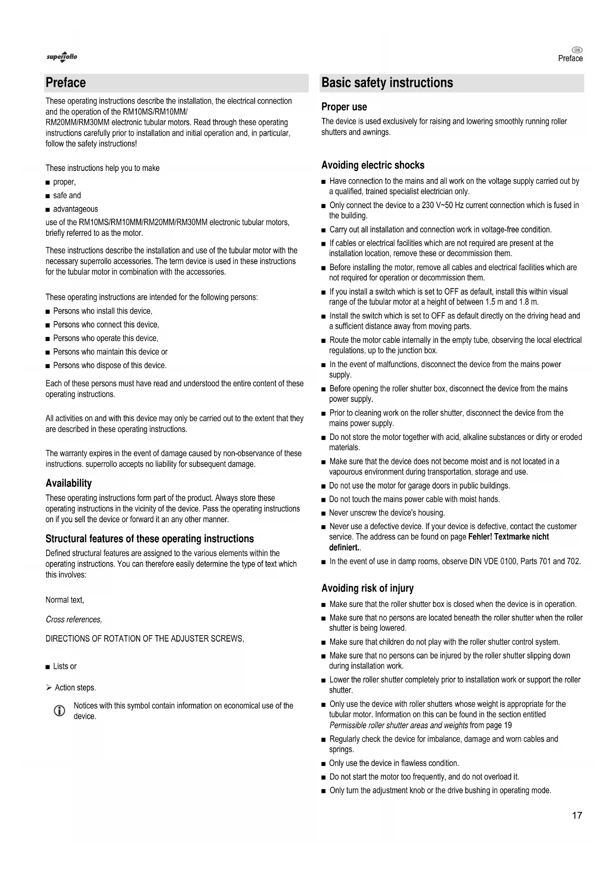 The superrollo RM10MS/RM10MM/RM20MM/RM30MM tubular motors meet the requirements of Low-voltage Directive 2006/95/EEC, EMC Directive 2004/108 EEC and all applicable European and national guidelines. Conformity has been verified. The corresponding declarations and documents are stored by the manufacturer.