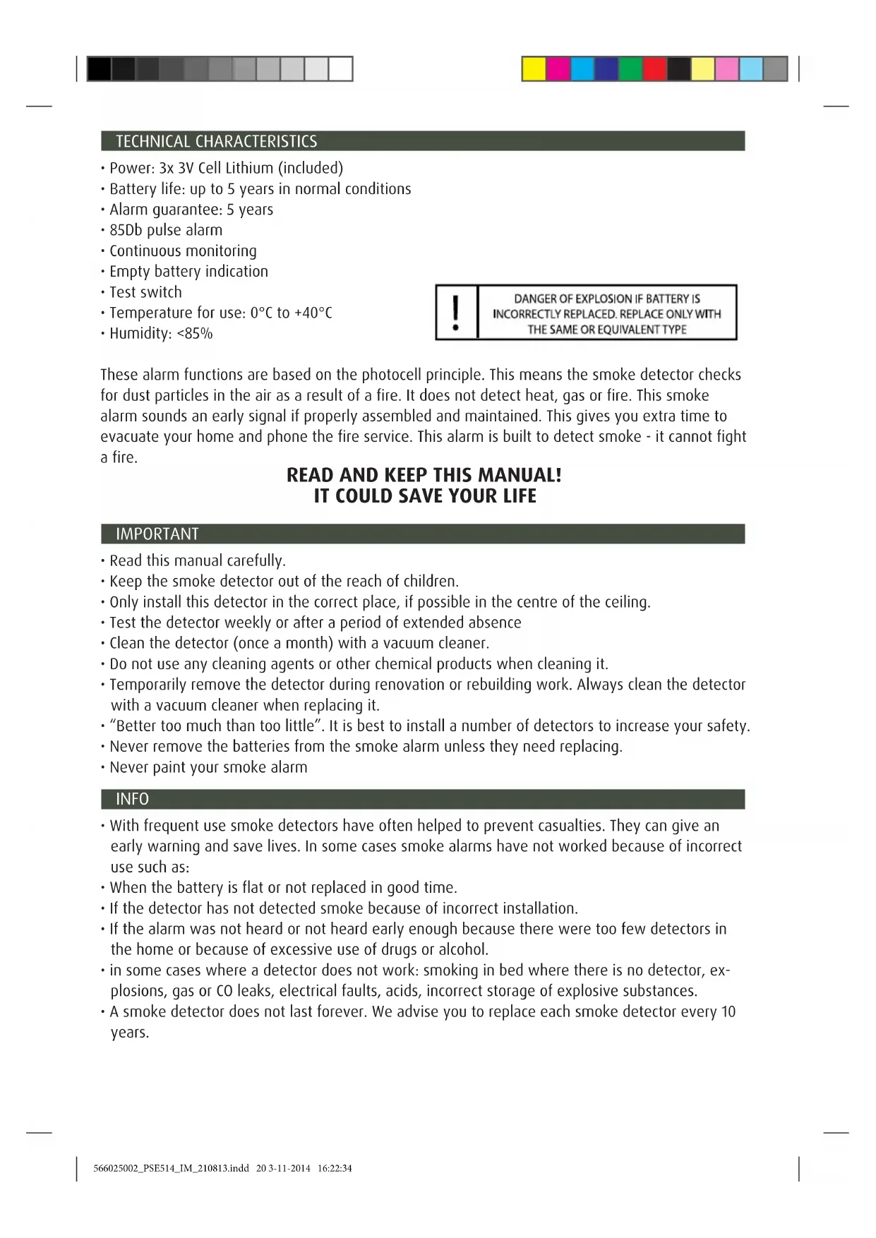 These alarm functions are based on the photocell principle. This means the smoke detector checks for dust particles in the air as a result of a fire. It does not detect heat, gas or fire. This smoke alarm sounds an early signal if properly assembled and maintained. This gives you extra time to evacuate your home and phone the fire service. This alarm is built to detect smoke - it cannot fight a fire.